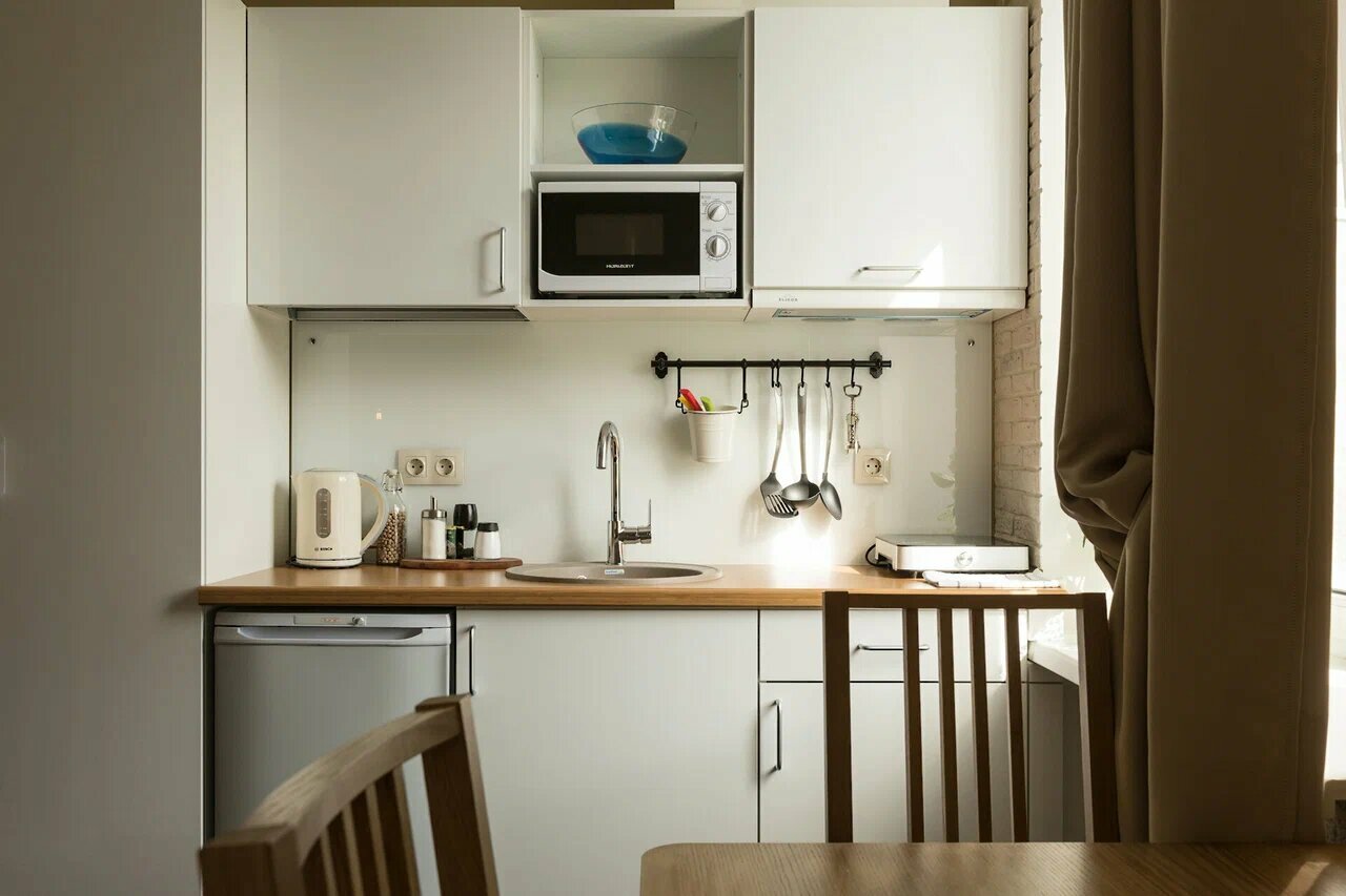 - Наличие мини-кухни с плитой, чайником, посудой и холодильником.