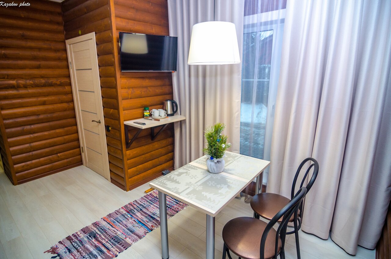 В номере очень уютно, чисто, есть все, что нужно. Очень отзывчивый персонал. На территории предпраздничная атмосфера, все в огоньках, для детишек есть деревянная горка. Относительно недалеко от центра города