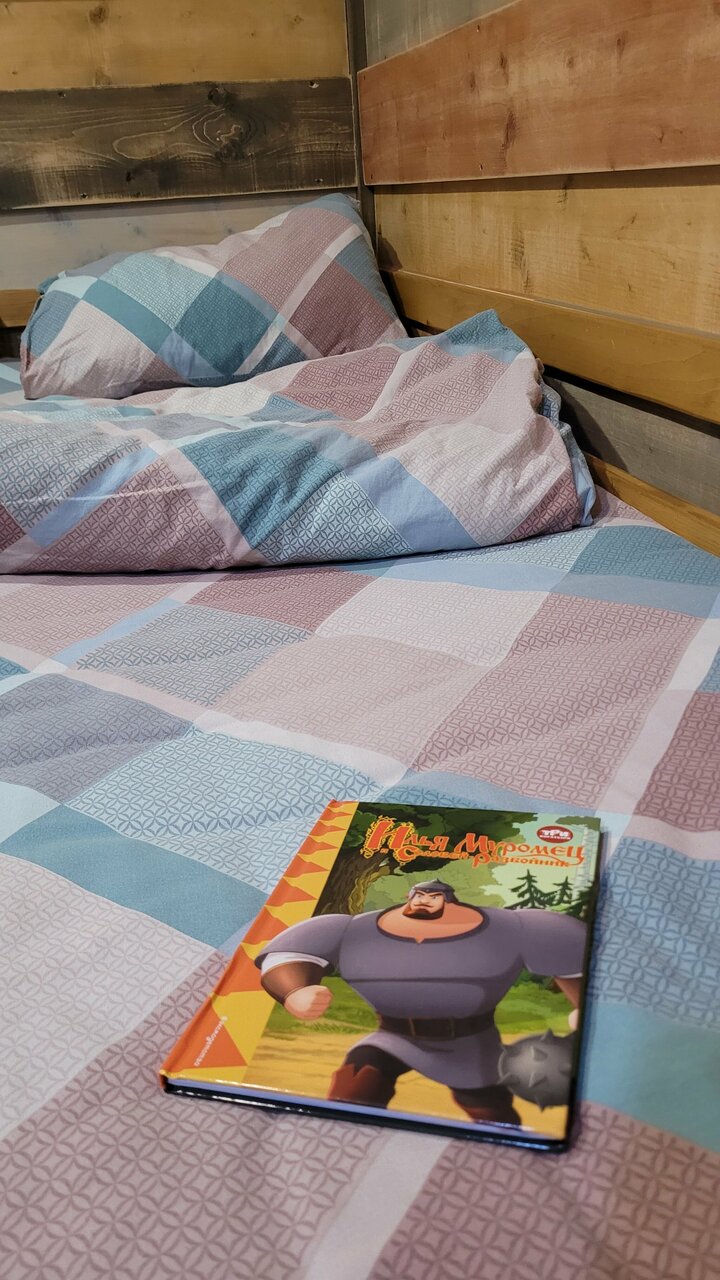 Очень душевный отель. Номер большой, чистый. Есть полотенца. На кухне есть плита, можно готовить еду. Микроволновая печка, чайник, приборы и всё необходимое есть. Ребенок под подушкой нашел конфетку приятненько. И еще нашли книжку со сказками. Стилизация очень впечатлила.