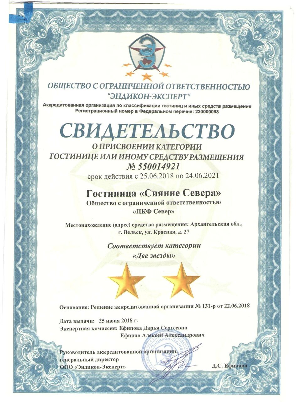 Гостиница «Сияние Севера» расположена в городе Вельск по адресу: Красная улица, 27. Заведение работает круглосуточно без выходных. Гостиница предлагает недорогие номера категории 3 звезды с Wi-Fi, телевизором, холодильником, феном, халатами и тапочками. На территории есть кафе, прачечная, камера хранения и бесплатная парковка.