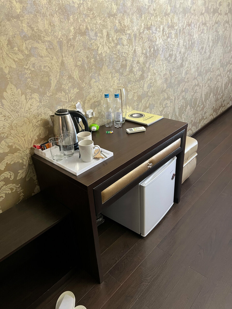 Элементы герба нашей малой родины г. Вельска — червленая бочка с серебряными обручами на золотом фоне, отлично вписываются в интерьер номера. Много дерева и прикроватные тумбы в форме бочки, очень уютно.