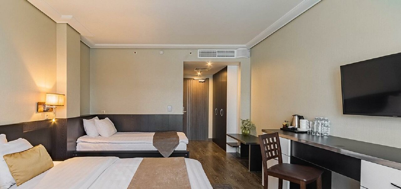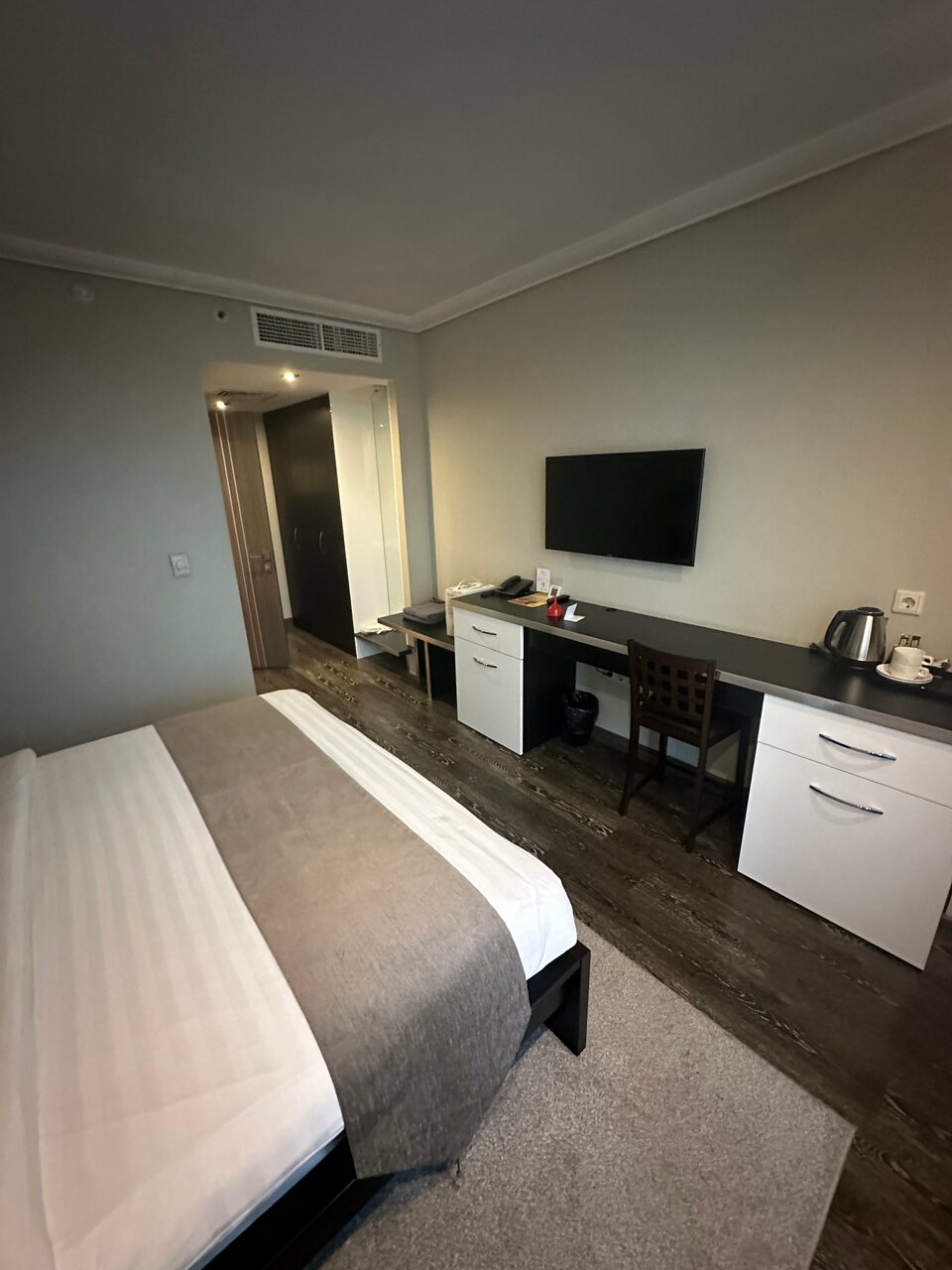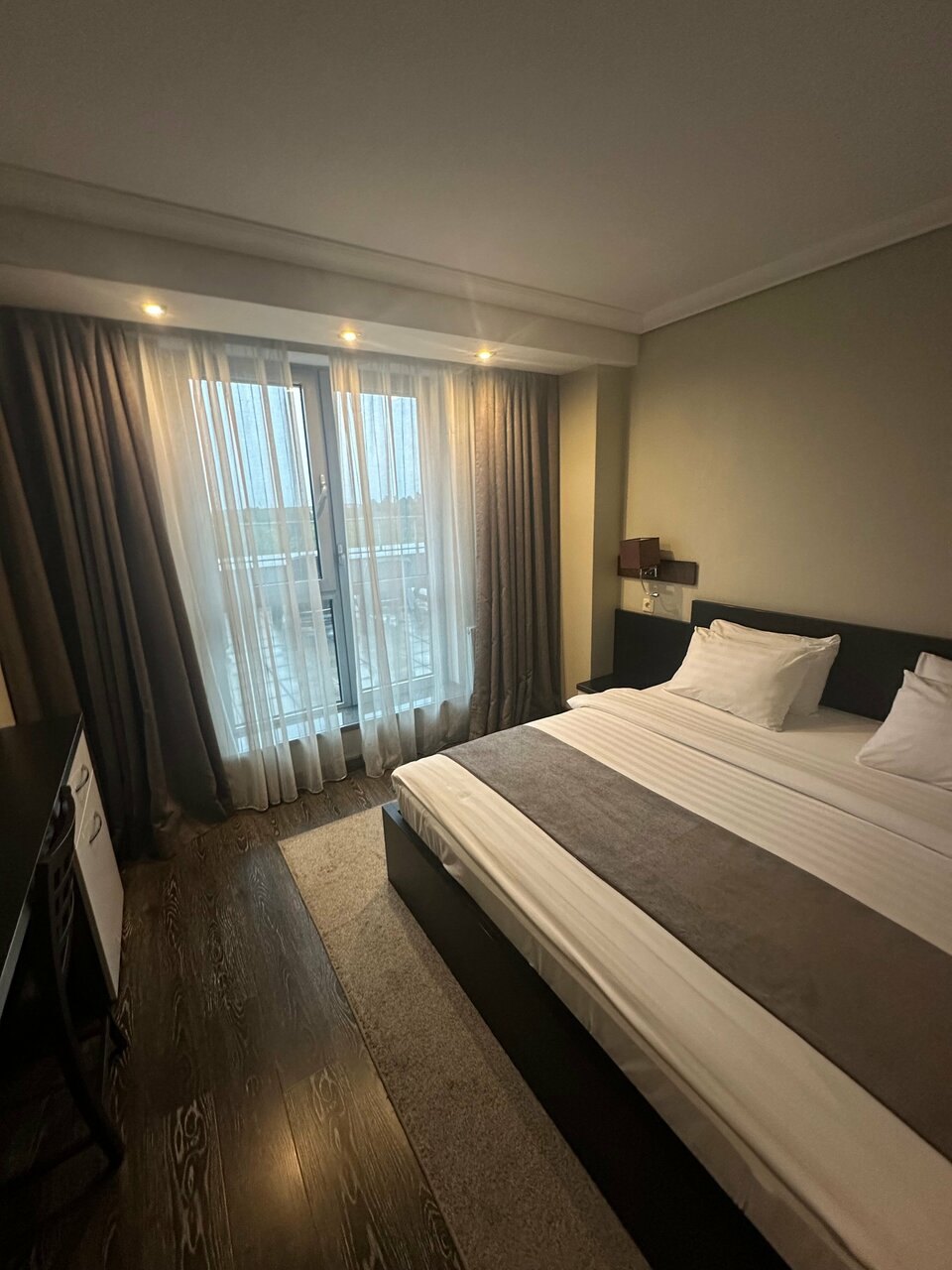 Хороший отель, вежливый персонал, чистые номера) Расположение понравилось тем, что через дорогу есть ТЦ, но вид из окна не самый впечатляющий) Брали пару раз стандартные номера и в общем все понравилось: есть такие необходимые вещи как чайник, холодильник, тапочки, полотенца, набор для чистки зубов, чашки, стаканы, чай, кофе, сахар, телевизор, сейф, вешалки и конечно же wi-fi) но, все таки минусы есть) Номер не просторный, гель для душа и шампунь в одной бутылочке ии волосы после него ужасные(не рекоменд), фен безумно слабый даже на самой большой мощности, звукоизоляция не самая лучшая, шторы зачастую даже если аккуратно закрывать, легко могут развалиться, но большой плюс, что они тёмные и создают полумрак даже при свете дня)