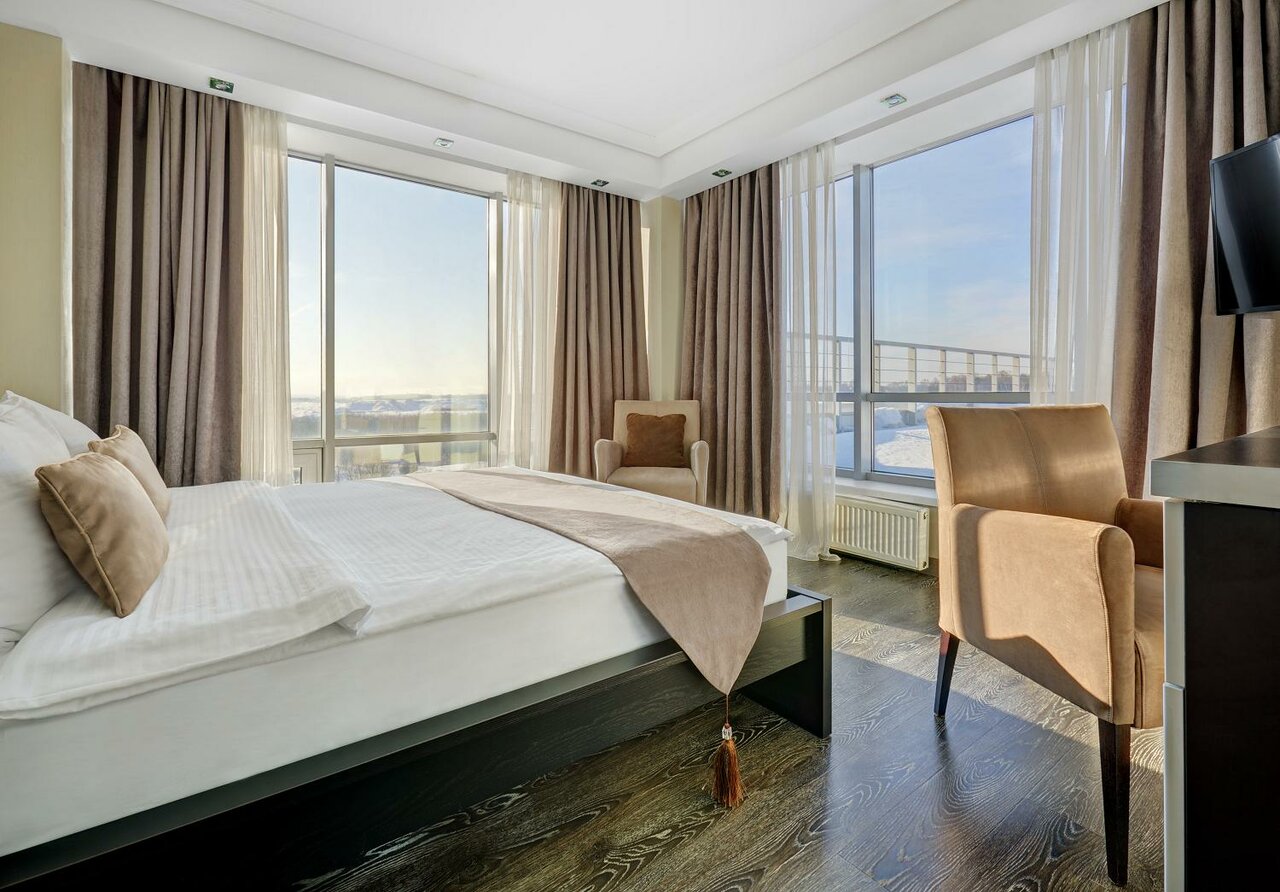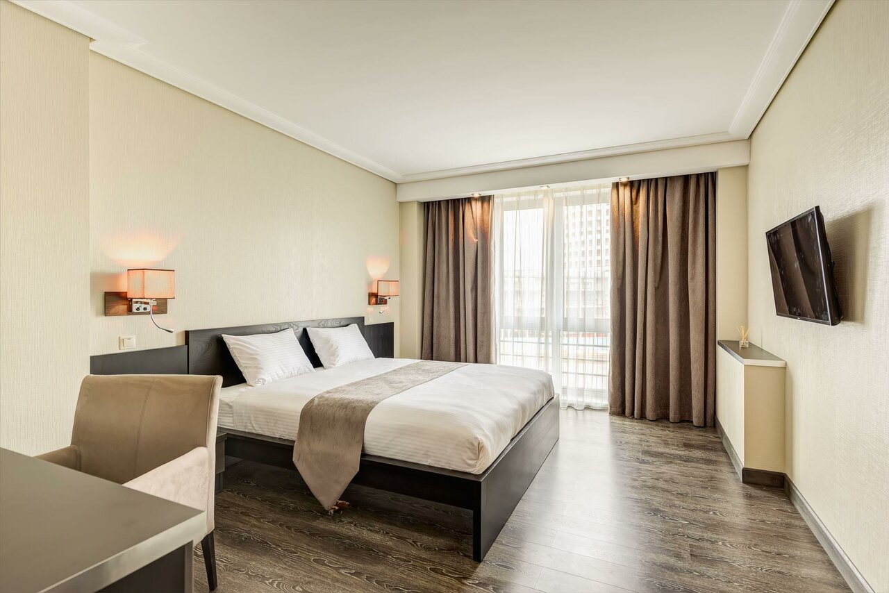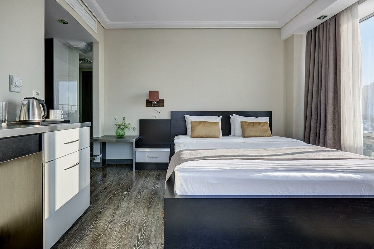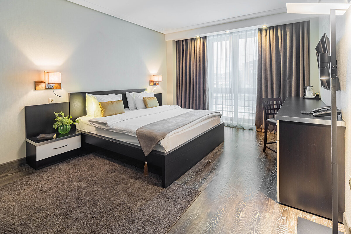 Хороший отель, вежливый персонал, чистые номера) Расположение понравилось тем, что через дорогу есть ТЦ, но вид из окна не самый впечатляющий) Брали пару раз стандартные номера и в общем все понравилось: есть такие необходимые вещи как чайник, холодильник, тапочки, полотенца, набор для чистки зубов, чашки, стаканы, чай, кофе, сахар, телевизор, сейф, вешалки и конечно же wi-fi) но, все таки минусы есть) Номер не просторный, гель для душа и шампунь в одной бутылочке ии волосы после него ужасные(не рекоменд), фен безумно слабый даже на самой большой мощности, звукоизоляция не самая лучшая, шторы зачастую даже если аккуратно закрывать, легко могут развалиться, но большой плюс, что они тёмные и создают полумрак даже при свете дня)