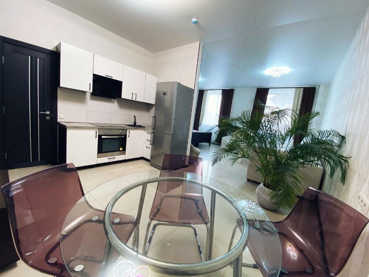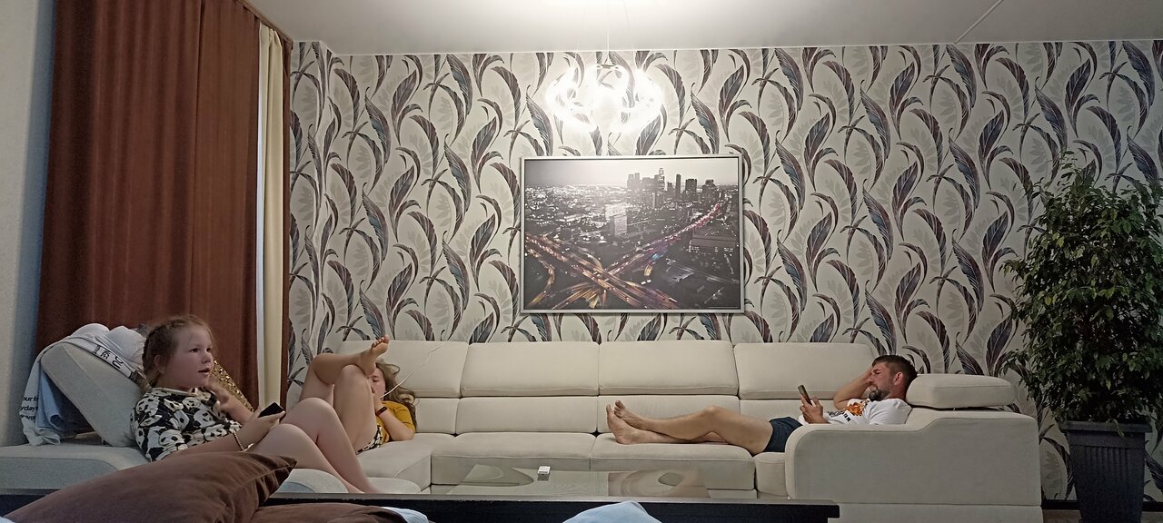 Двухместная кровать, большой угловой раскладной диван, кухня с большим холодильником и обеденным столом на 4х, комфортабельный номер с туалетом, ванной, феном, телевизор 43' со смарт-тв, кондиционер и бесплатный wi-fi