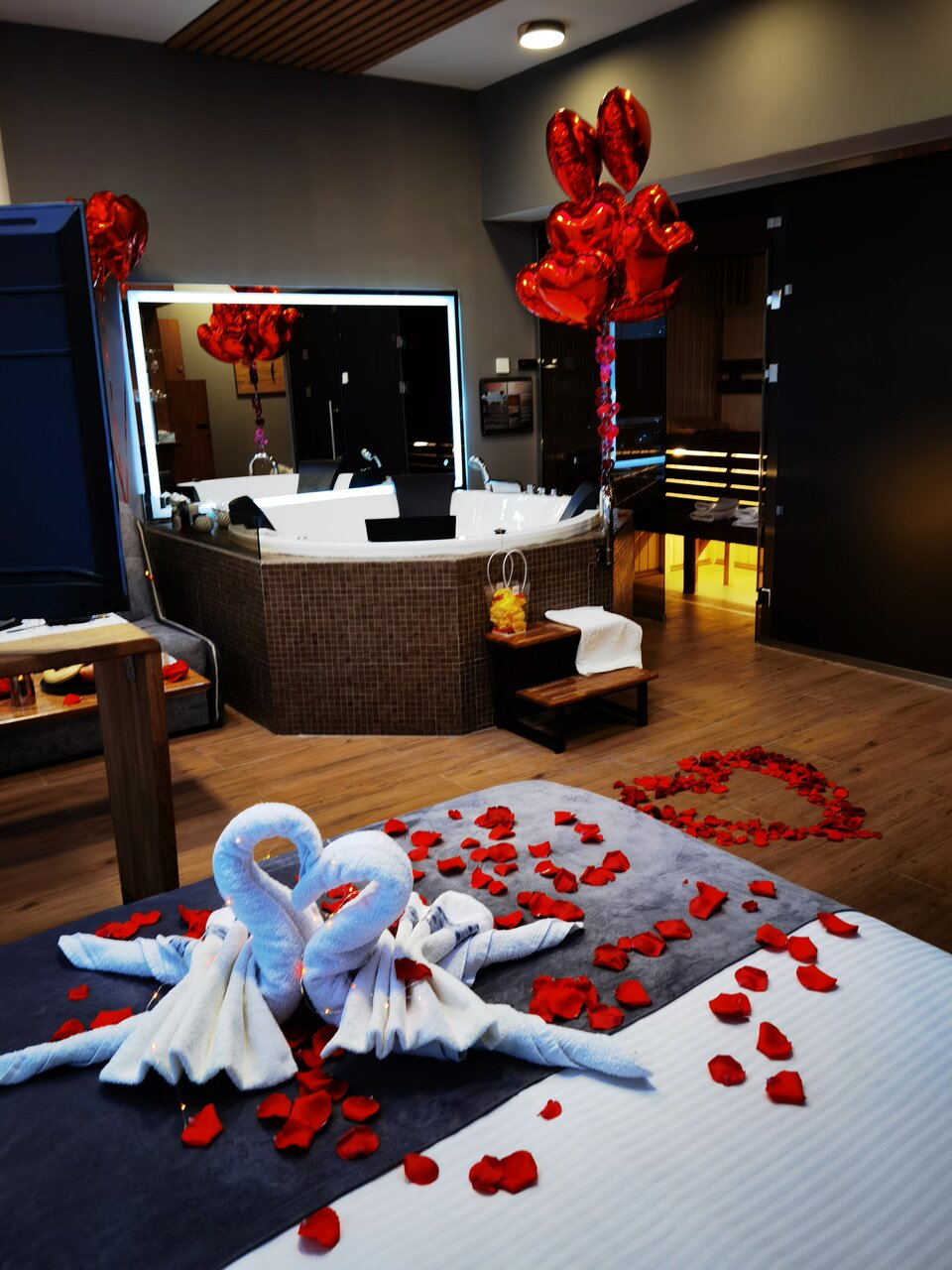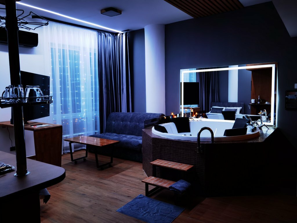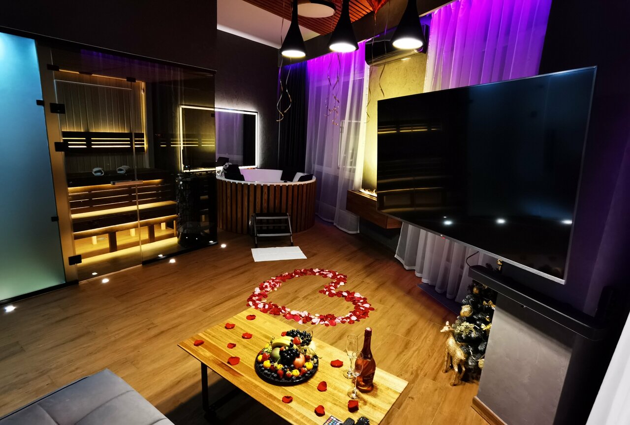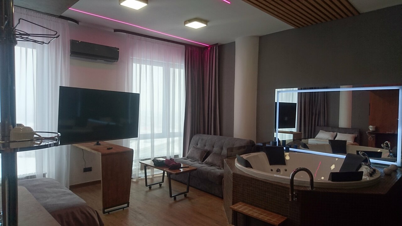 Замечательные апартамены ! Джакузи , сауна , огромный телевизор , ргб подсветка создает романтичную атмосферу . Одноразовые тапочки , халаты , полотенца , умывательны принадлежности в наличии. Мы с женой всем довольны