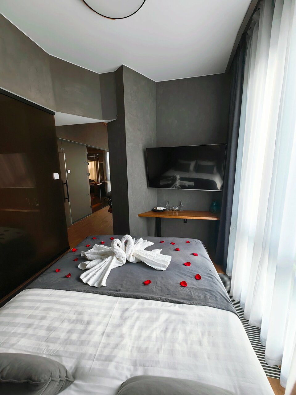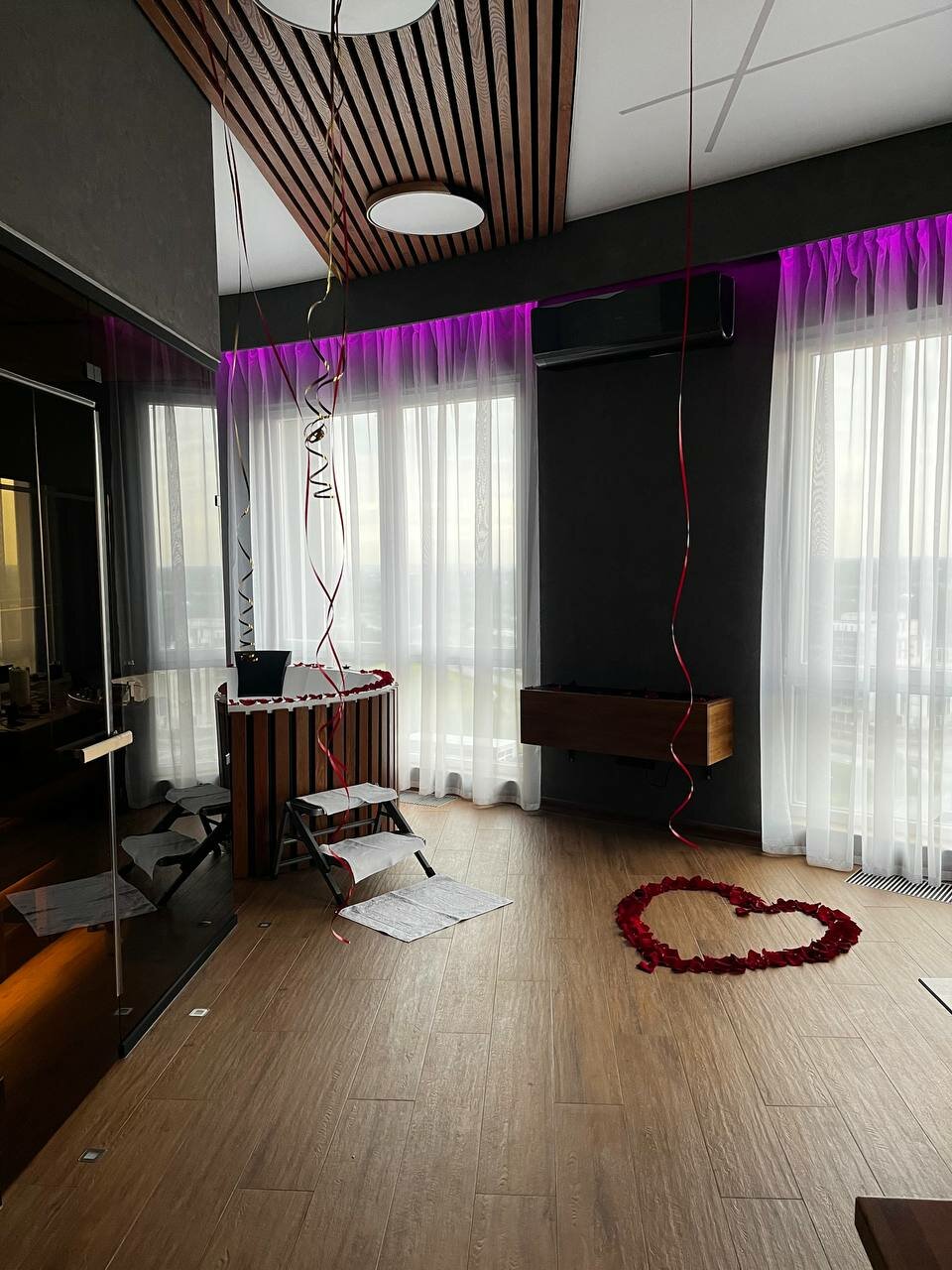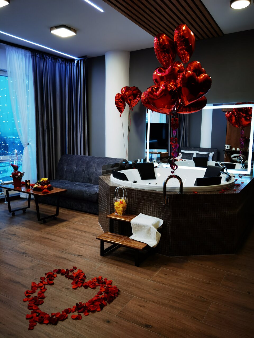 Оформление номера на праздник, годовщину:- оформление лепестками + лебеди на кровати = 2500р- фруктовая корзина = 2500р- оформление гелиевыми шариками = 350р/шар