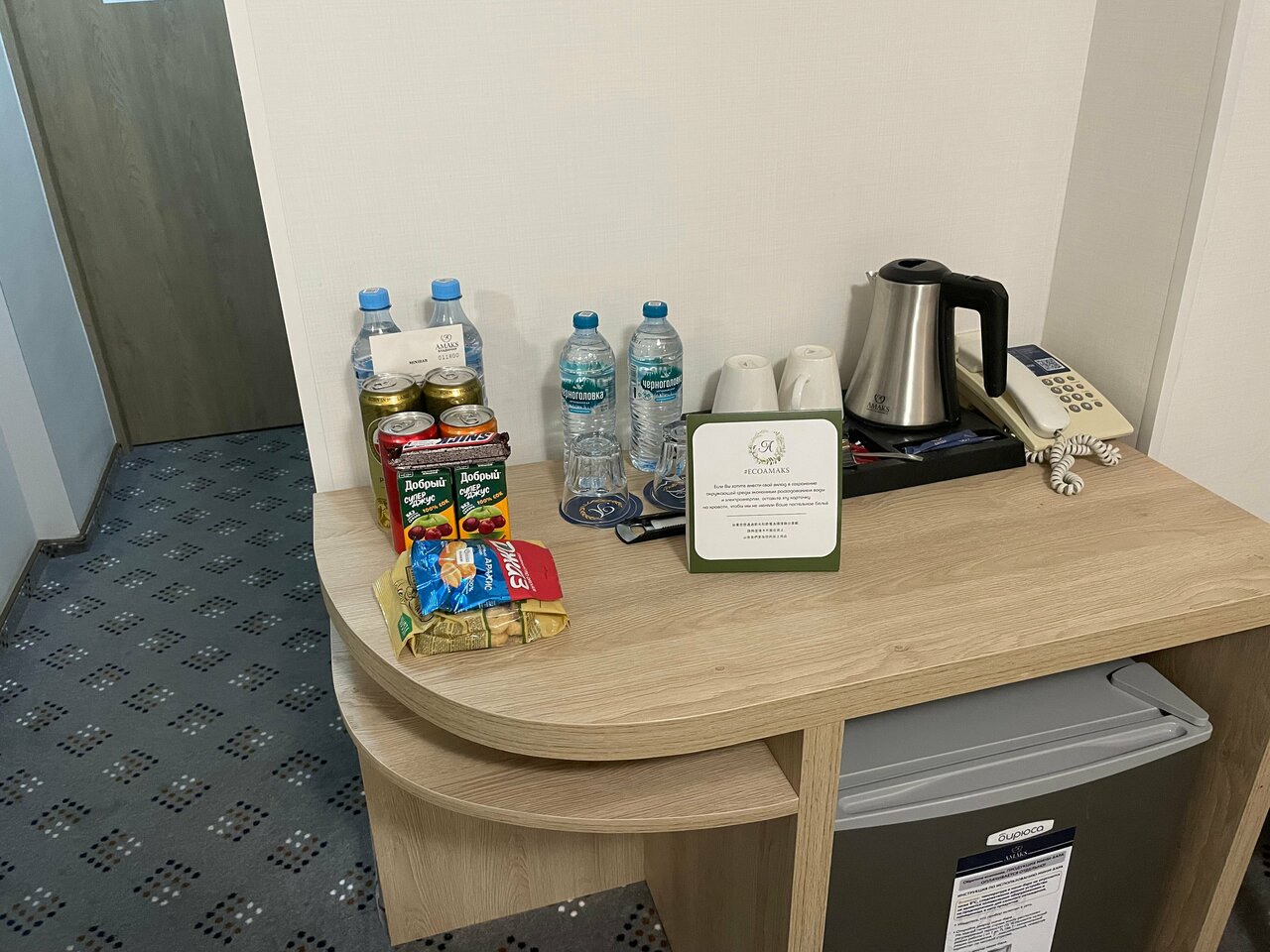 В общем отель не плохой. В номере чисто. В столовой ( назовем так) приятно. Но с питанием беда. Мы заселились вечером. Выбора нет от слова совсем. Кофе нет только кипяток. Это как. И это 3 звезды? Ну скажу честно не ожидала. В номере одноразовых принадлежностей нет. Ни набора с зубной пастой ни Геля. Только полотенца и мыло.