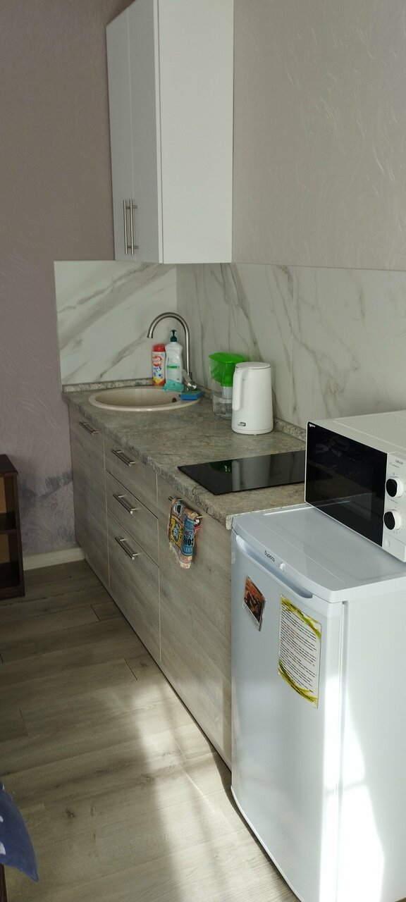Стоимость нашего двухместного номера была 2700 р. в сутки. Плюсы: в номере есть всё для комфортного проживания, помимо телевизора, кровати и тумбочек есть небольшая кухня с холодильником, микроволновкой, электрочайником, плитой и посудой. Много розеток с ЮСБ-портами. Много вариантов освещения. Москитные сетки. Фен в шкафу. Удобная ванная комната. В коридоре гладильная доска и утюг. Вход в апартаменты по коду. До центра и вокзалов недалеко. Рядом кафешки и магазины. Минусы: нет кондиционера, вентилятора и вентиляции, в жару в номере просто ад и баня.