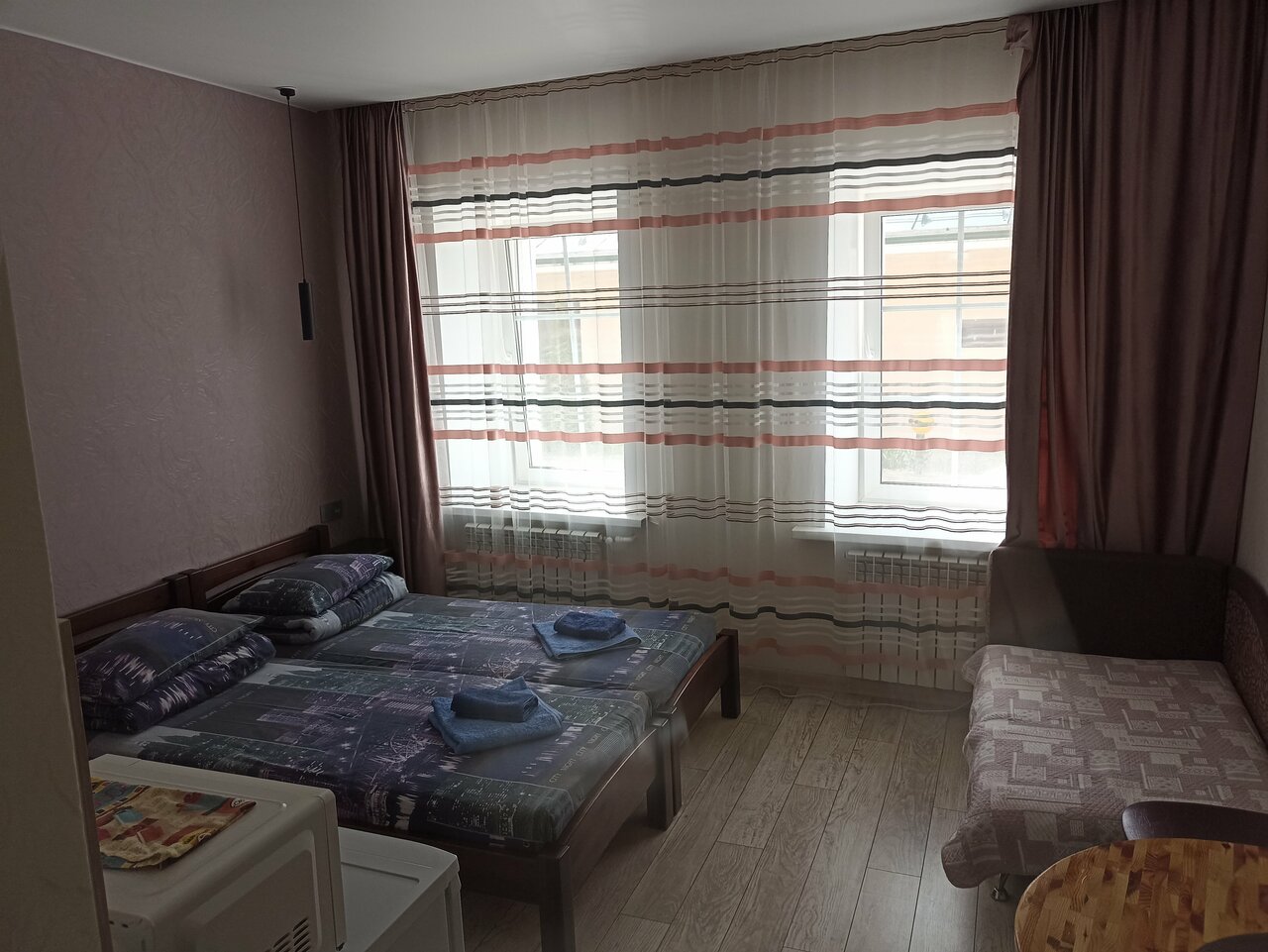 Отличное расположение: вокзал (жд и авто) и центр города в 10 минутах ходьбы. В номере есть все необходимое (холодильник, электрочайник, микроволновка, электроплита, wifi, телевизор с большим пакетом каналов, два больших окна с плотными занавесками, сенсорный кодовый замок на двери номера + классический чтобы закрываться изнутри, фен). Также была посуда, столовые приборы, сахар, чай, подсолнечное масло, сковородки, кухонное полотенце; в ванной — мыло, шампунь, гель для душа, по 2 полотенца на человека, плюс 5ое на двоих. Заселение и выселение полностью бесконтактное, администратор высылает всю информацию на телефон. У нас была возможность заселиться на пару часов раньше. Улица тихая, соседей из других номеров не видно и не слышно. Чисто, ремонт сделан недавно.