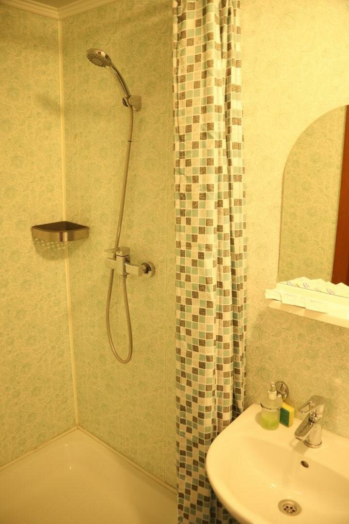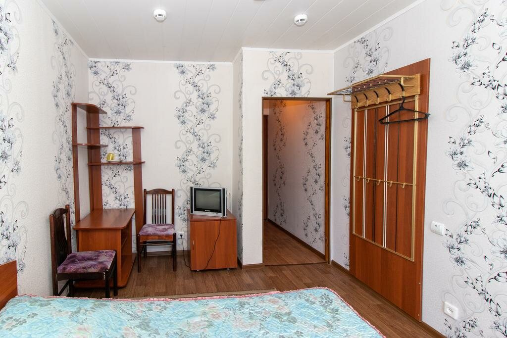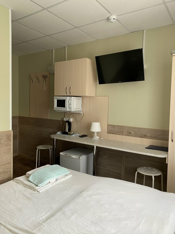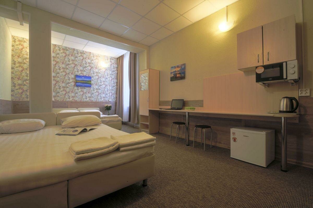 Соотношении цена-качество на 5. Достаточно удалён от центра, но учитывая стоимость, это не расстраивает. Хотя, автобусы ходят очень редко, ждали около 20 минут автобус до вокзала, в итоге поехали на такси. Свежий ремонт, вполне приятно и чисто. Трёхместный номер за 1,5 тысячи оказался четырёхместным, что порадовало) В номере телевизор, холодильник, микроволновка, чайник и фен. Посуда (3 тарелки, 4 кружки, вилки, ложки), НО, вилки оказались грязными, видимо кто-то когда-то не помыл, а горничные не обратили внимание, это немного огорчило. Постельное белье и полотенца чистые, в туалете несколько рулонов туалетной бумаги, пробники шампуня и геля для душа из расчёта по одному на человека, жидкое мыло. На этаже видели гладильную доску и утюг. Заселили минут за 5, быстро и без проблем, выселили ещё быстрее) В целом, переночевать одну-две ночи, очень даже замечательно.
