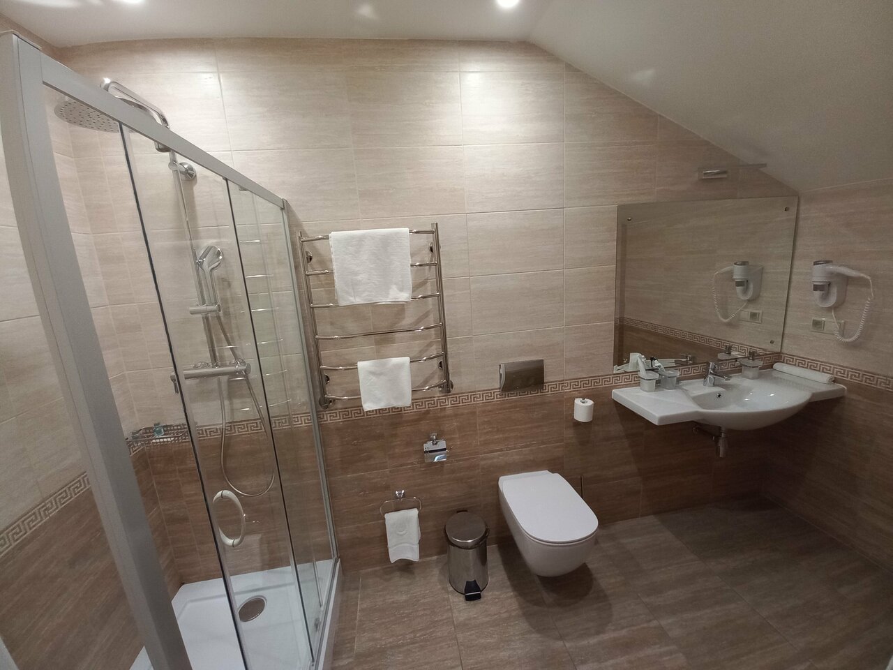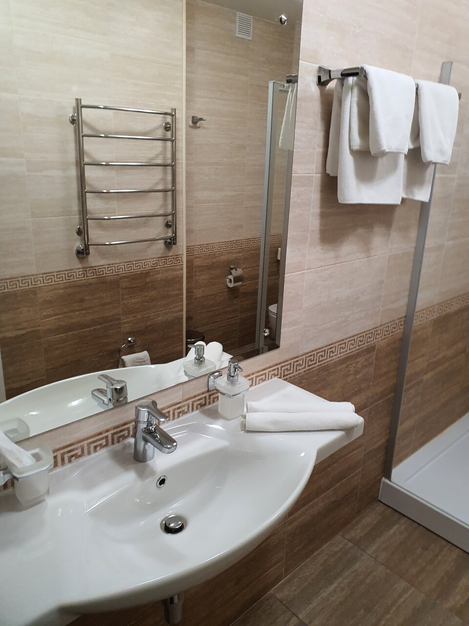 Ночевали в номере люкс . Пол в ванной грязный ( волосы и пыль), под раковиной тоже пол в пыли . Пригласила администратора , показала грязь, на что админ ответил мыли пол в день заселения. В ванной комнате пол не моют!