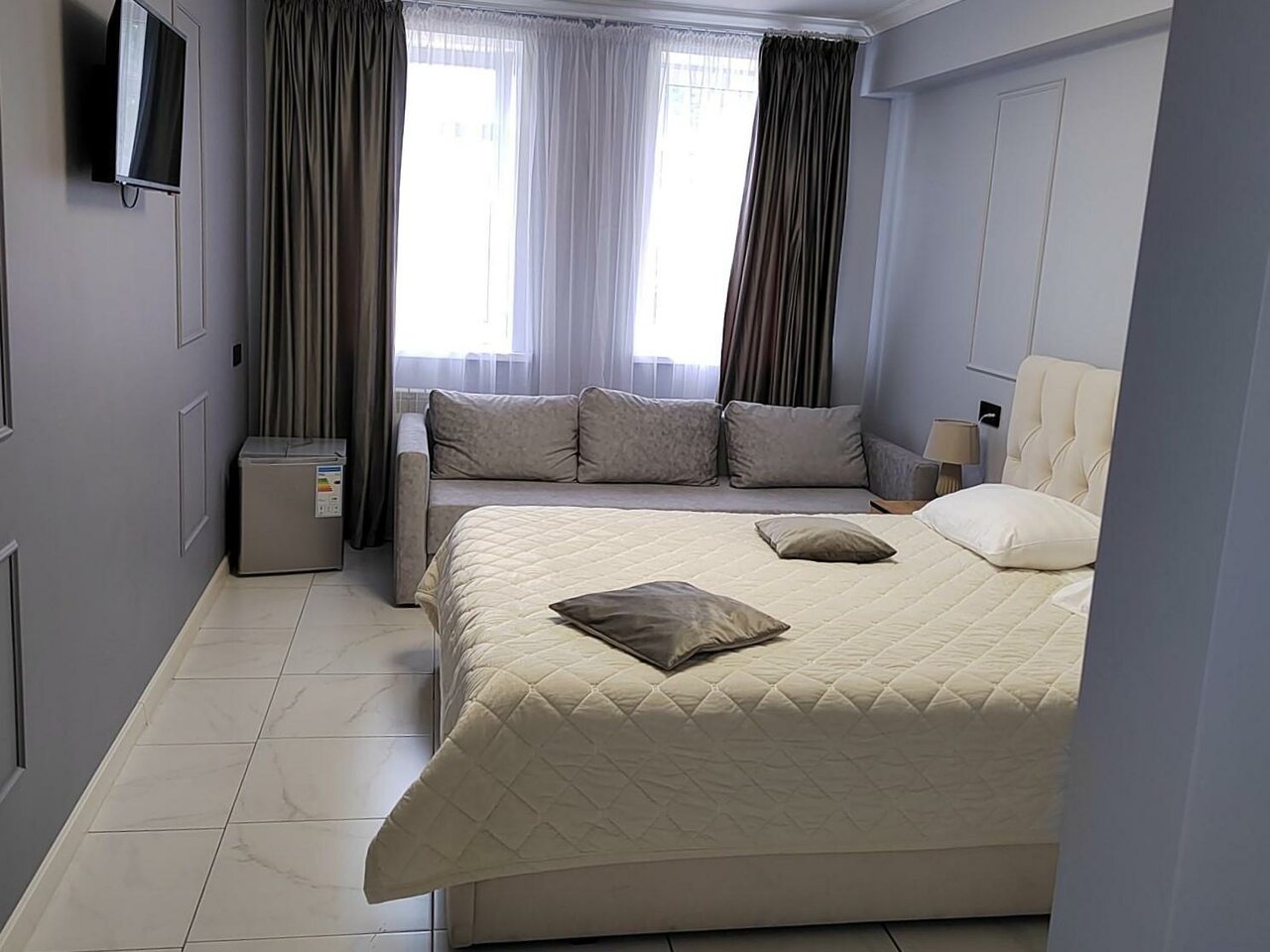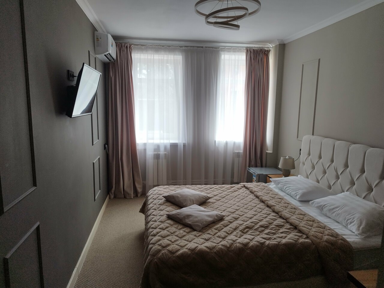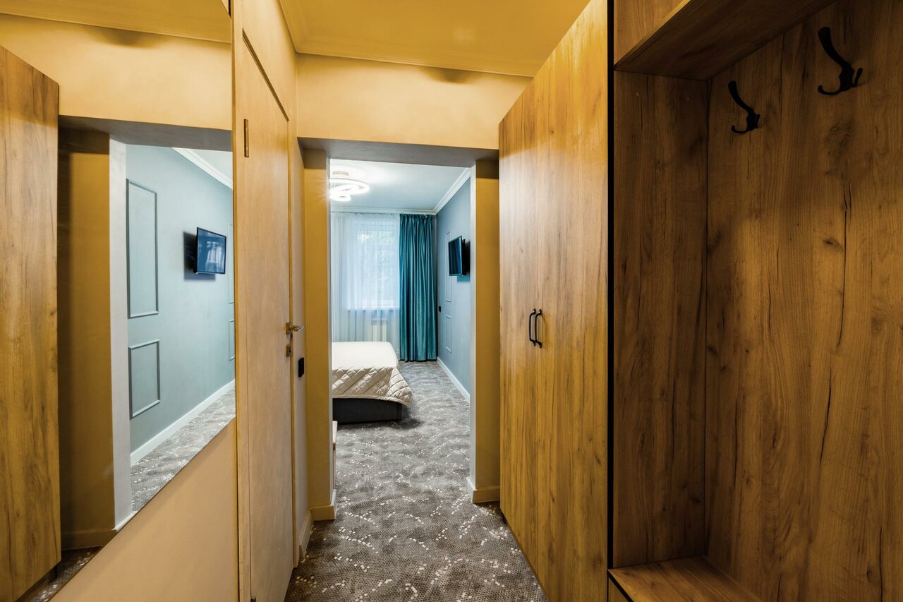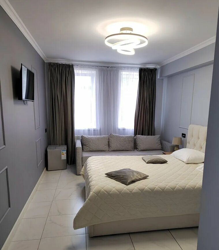 Свежий ремонт, понравился дизайн и обстановка номера, чисто. Отзывчивый персонал. Отдельное спасибо за душ и ежедневную уборку. Минус только один — запах канализации из душа, но первые 3 дня не особо беспокоил. Под окном уличное движение не беспокоило, соседей не было слышно. Шкаф вместительный. Микроволновка, фен, телевизор работали хорошо. В холодильнике не было необходимости. Плюс — гладкий пол без ковров, ковриков и ковролина. Рядом Перекрёсток и Шоколадница. До музеев ходили пешком, недалеко. Хорошо отдохнули.