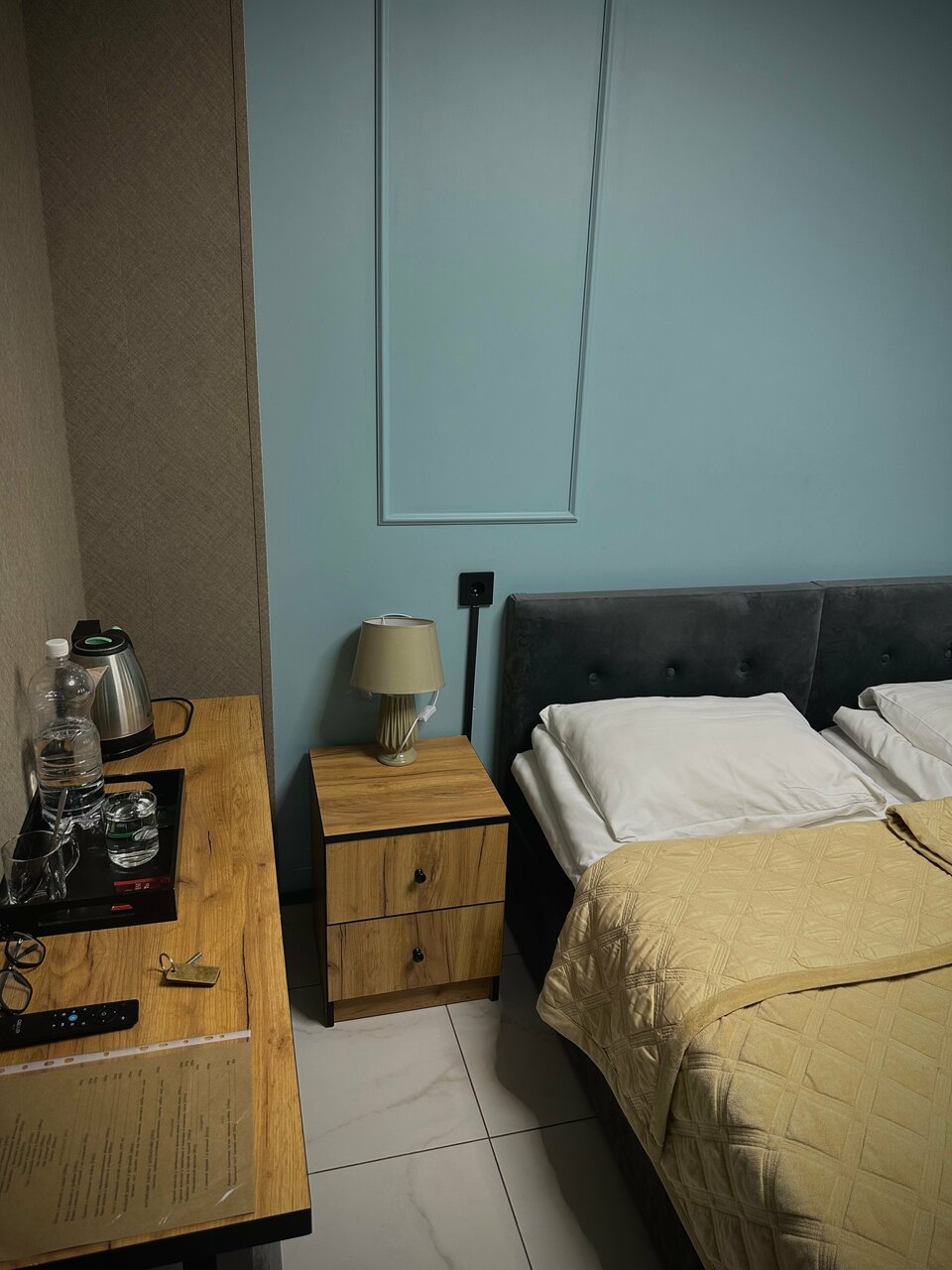 Номер небольшой, но с первого взгляда достаточно чистый. Для меня кровать оказалась слишком мягкой. На окнах нет сеток, поэтому залетают комары и мошки. Завтрак в соседнем кафе в формате ‘можно выбрать из четырёх блюд и четырёх напитков’. В первый день в списке напитков был кофе, а во второй уже нет. Не очень вкусно, да и наесться не получится. Но главным и самым весомым минусом стала ванная комната. Очень сильный запах затхлости, канализации и сырости. Вентиляция явно не справляется, а душ капает ещё долго после выключения. Полотенца не меняли, новые пакетики шампуня не клали. В номере есть тапочки, чайник, бутылка воды, два чайных пакетика и зубной набор. Были в отеле два дня, но большое, думаю, не приедем и не посоветуем