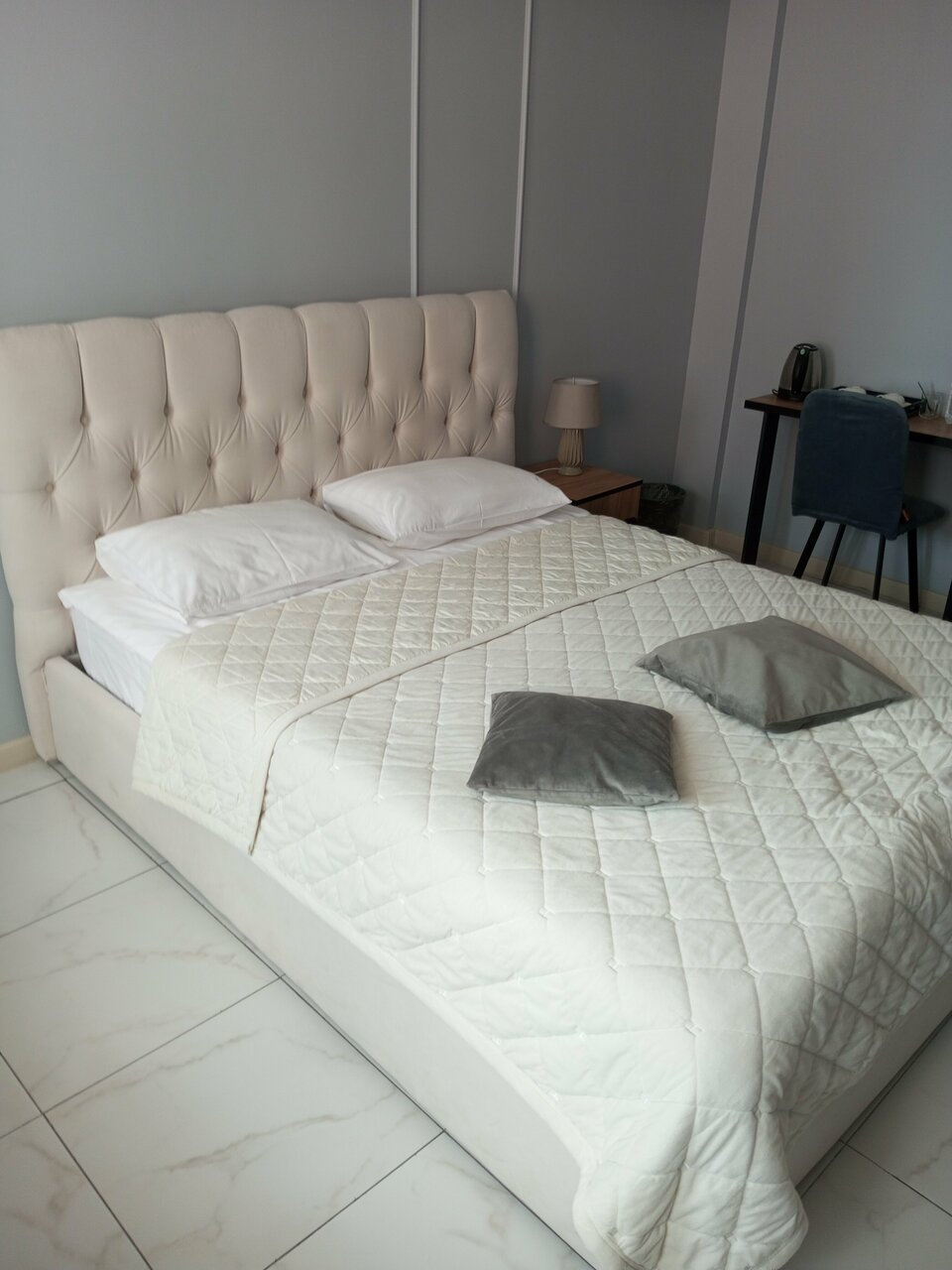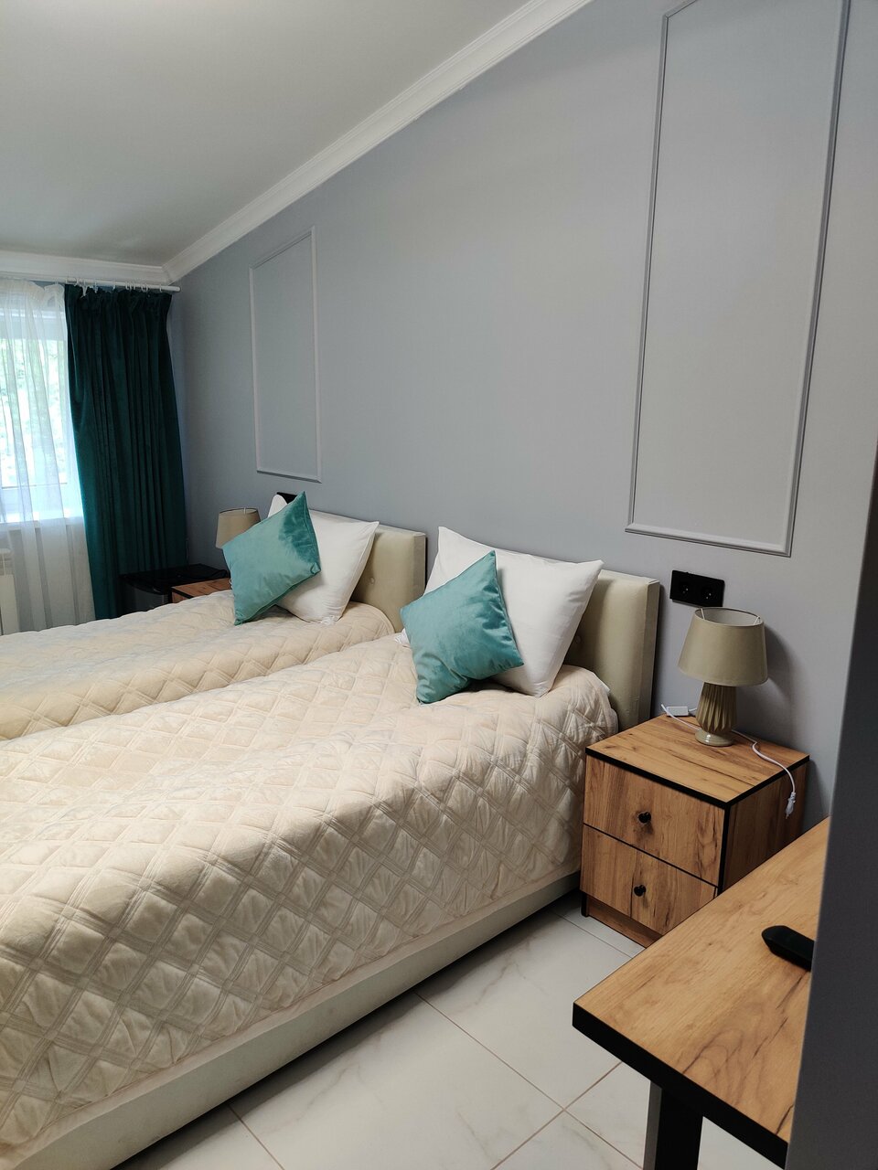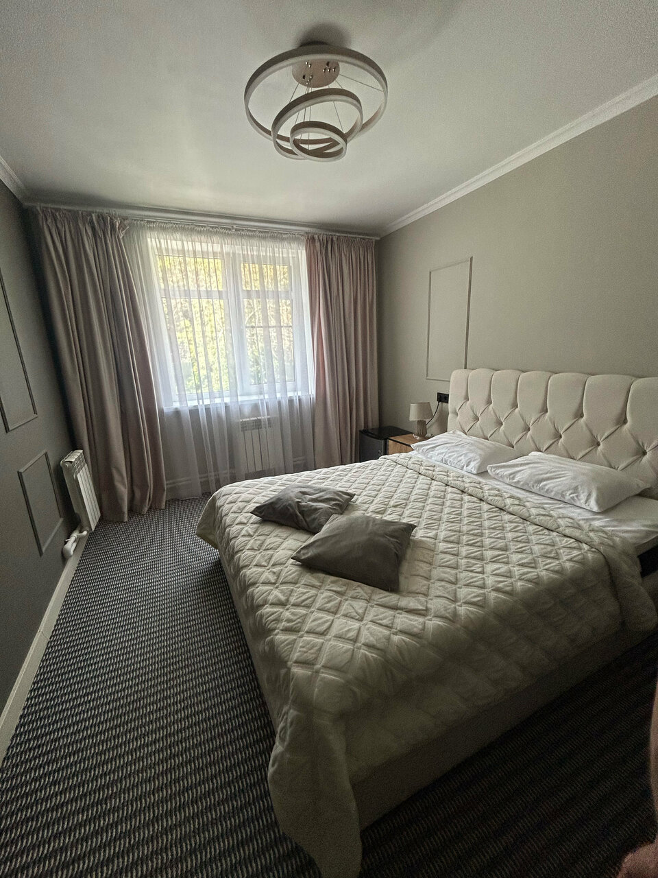 Отличный отель. Персонал вежливый и компетентный. Заранее позвонили и уточнили подтверждение бронирование, так как не было предоплаты. Номер чистый, белье свежее, сантехника вся блестит. Всё на высшем уровне. В номере предусмотрено, мы заказывали двуспальную кровать — нам ее предоставили, именно цельную двуспальную кровать (не две соединенные). Туалетные принадлежности в наличии.