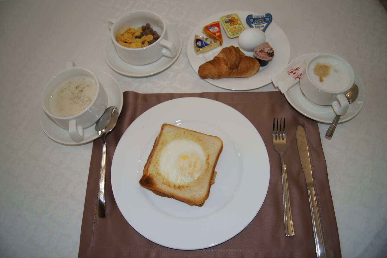 Отель простой, зато недорого. Совсем рядом со станцией, что нам было важно. Девушка на ресепшене пошла нам на встречу и накрыла нам на стол полчаса раньше обычного начала завтрака, так как иначе мы бы не успели на электричку. Завтрак домашний на выбор — молочные кашки, запеканка, яичница — нормальная еда. Подушка вот только низковата, надо может две таких класть — дополнительно подкладывал под голову халат.