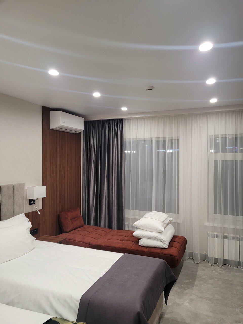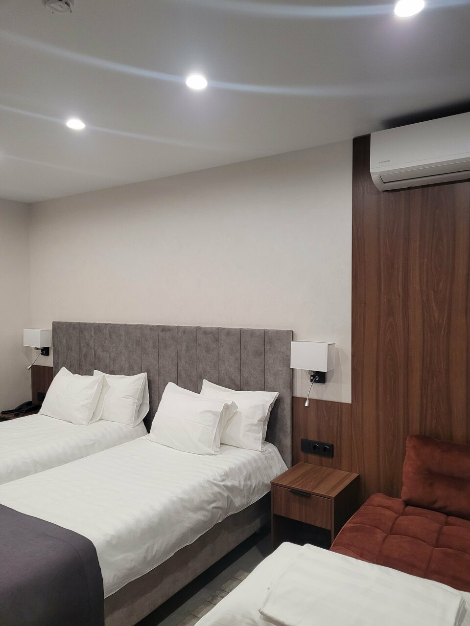 Стандартный двухкомнатный номер две двуспальные кровати (King-Size)180*200 Площадь - до 53 кв.м., рассчитан на 1- 4 человек. Виды из окон на город. Два санузла.
