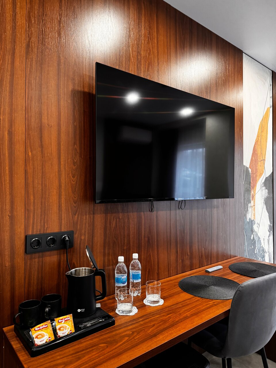 - Современный дизайн и ремонт.; Наличие сейфа и Smart TV.; Вкусные и сытные завтраки (несколько вариантов).; Большая парковка (включая зарядки для электромобилей).; Новый, чистый отель.