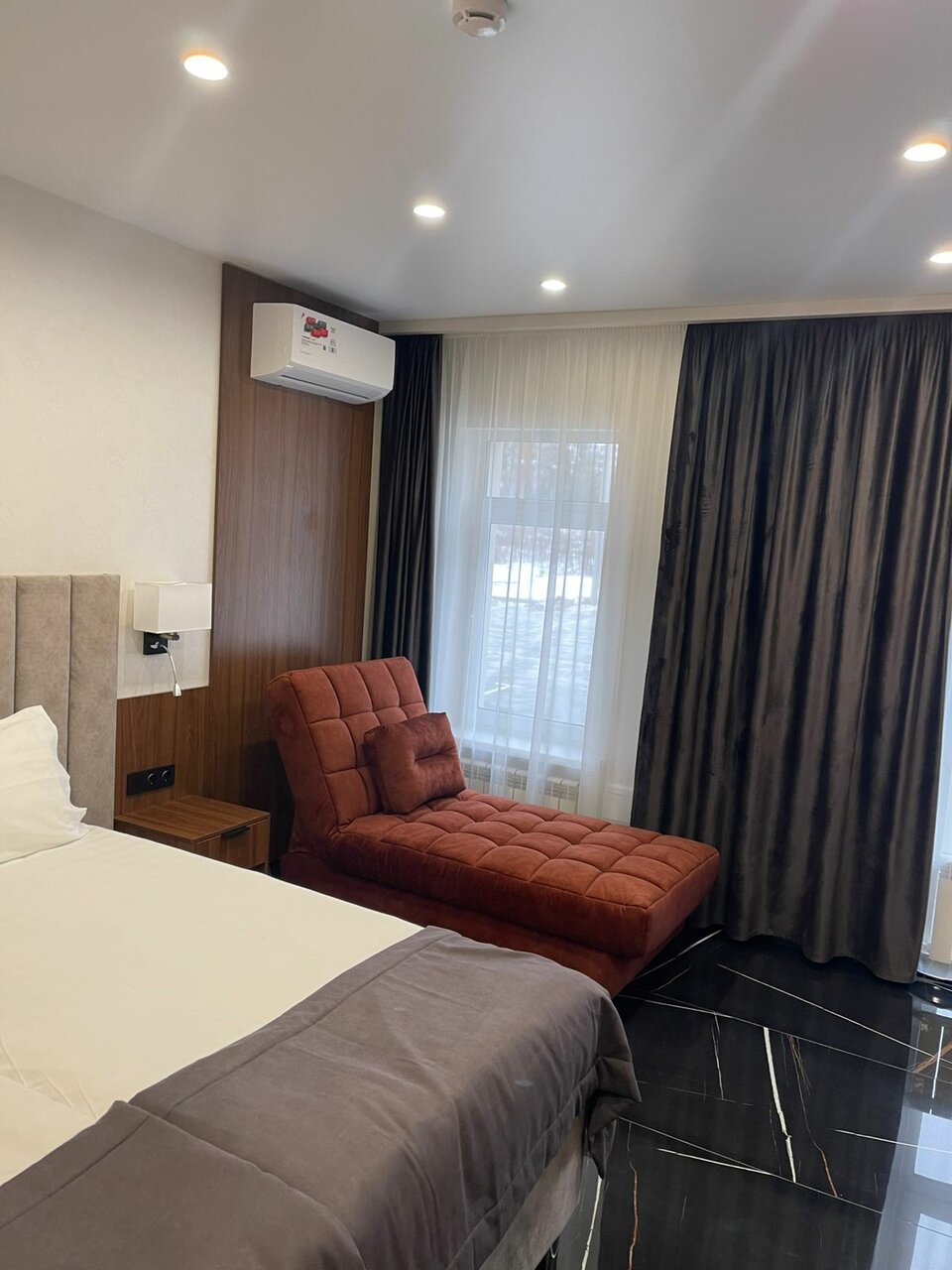 Цена: от 3800 рублейСтандартный однокомнатный уютный номер с двуспальной кроватью King-Size(180*200). и кресло (раскладывается для 1-го человека). Площадь номера - до 27 кв.м., рассчитан на 1-3 человек. Виды из окон на город.