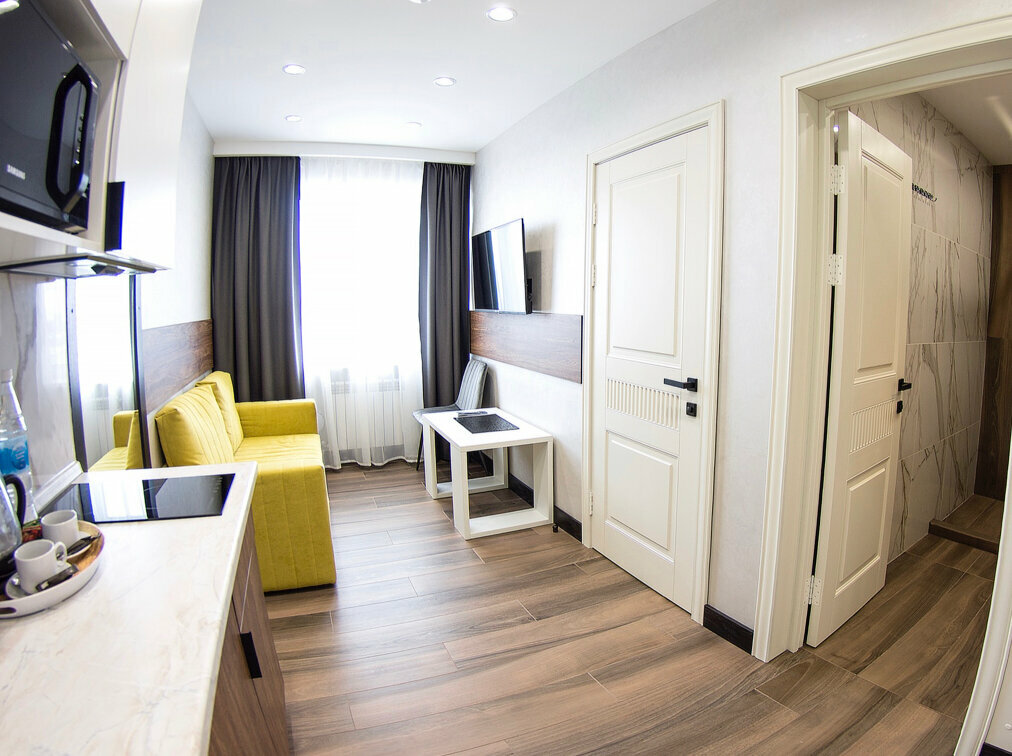 Прекрасный отель! Останавливались на 2 ночи 25 июля — 27 июля 2022. За такую бюджетную цену прекрасный номер комфорт с мини кухней , микроволновкой, чайником, набором посуды, и даже индукционной панелью, кондиционером.Очень чистый современный номер, все туалетные принадлежности, даже халаты. Очень вежливый персонал, отличное кафе на первом этаже с бюджетными ценами, где за небольшие деньги можно отлично позавтракать!Единственное неудобство, что окна выходят на шумную улицу, но достоинства перевешивают. Очень довольны , что выбрили этот отель!Однозначно порекомендуем всем!