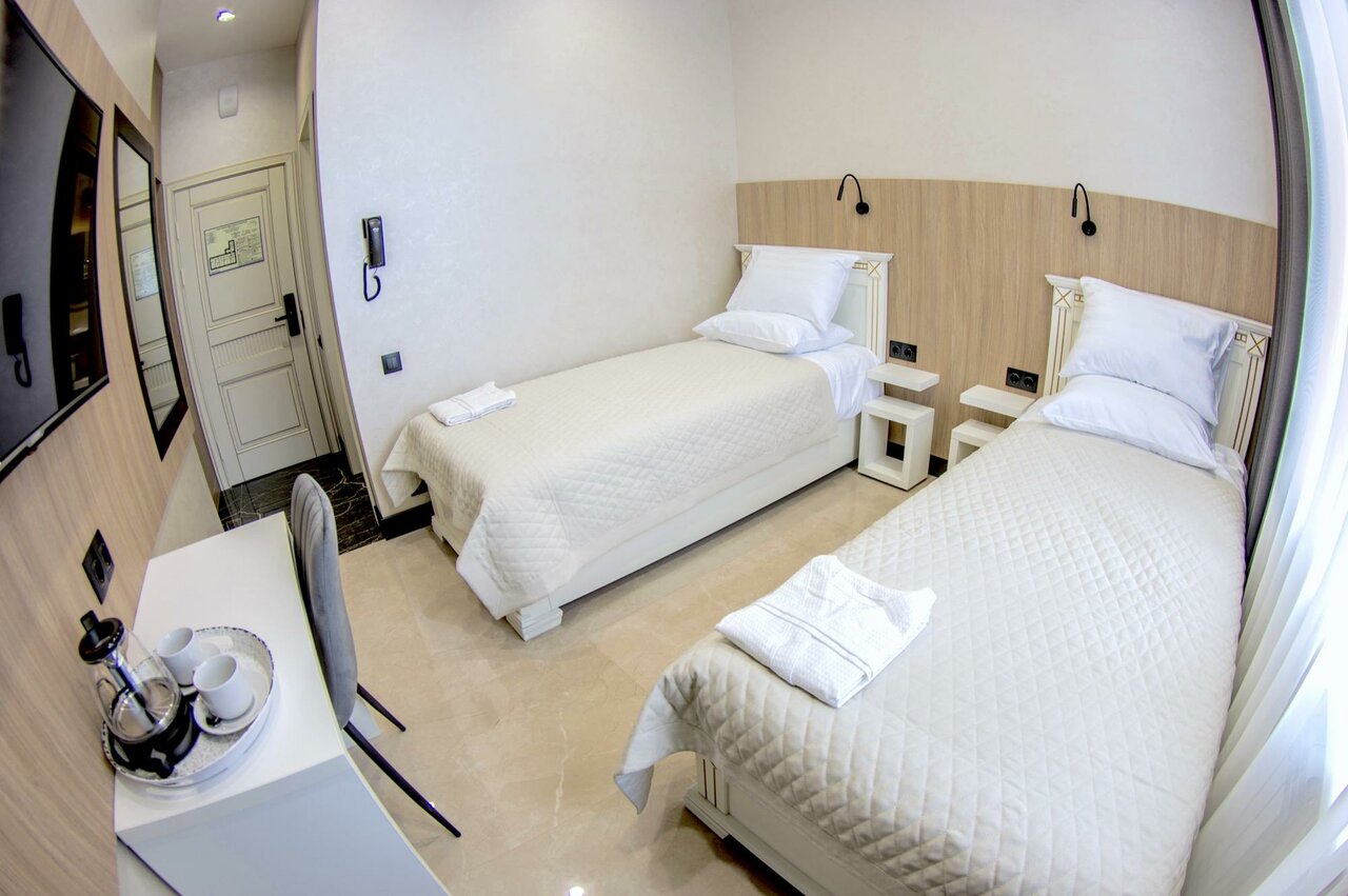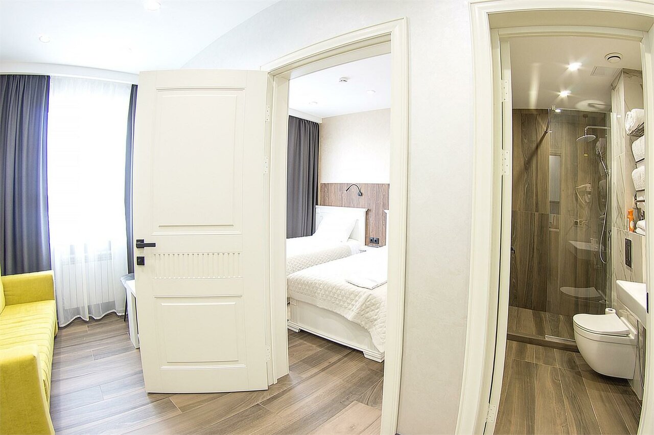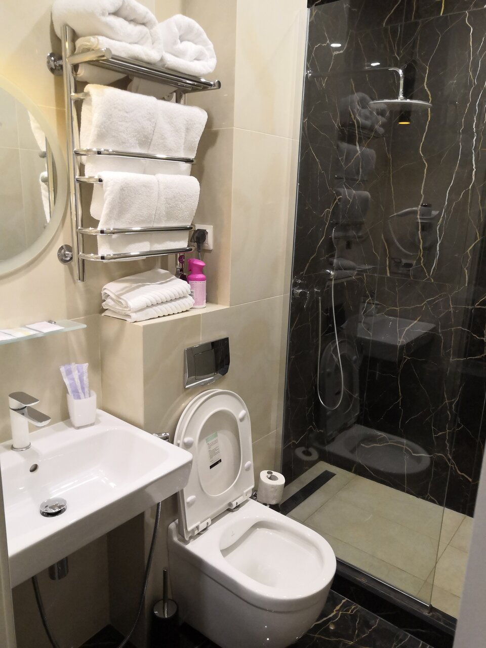 Отель новый. Пристройка двух подъездов к новому же жилому дому. Действительно очень качественные три звезды, чётко соответствующие стандарту. Номер ‘стандарт’ — небольшой, при этом всё есть и всё помещается. Прекрасный телевизор, устойчивый Wi-fi сигнал, хороший свет, удачная мебель, высокие потолки. На сантехнике не экономили, всё смонтировано хорошо, качественная отделка. Полы из гладкого керамогранита, чисто. Из минусов — очень скромные завтраки в пекарне на первом этаже. Впрочем, ассортимент меню можно расширить за дополнительную плату.