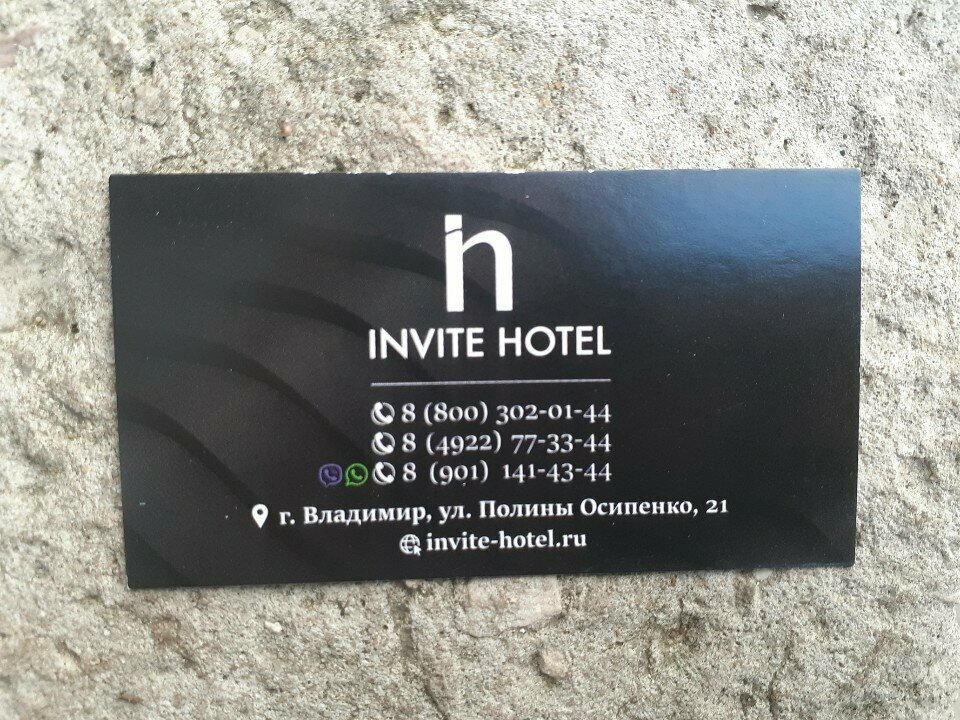 Invite Hotel — трёхзвёздочная гостиница во Владимире, расположенная по адресу ул. Полины Осипенко, 21. Отель работает круглосуточно и предлагает комфортные номера с кондиционером, Wi-Fi, телевизором, холодильником и санузлом. Гостям доступны звукоизолированные апартаменты с кухонными уголками, феном, халатами и тапочками.