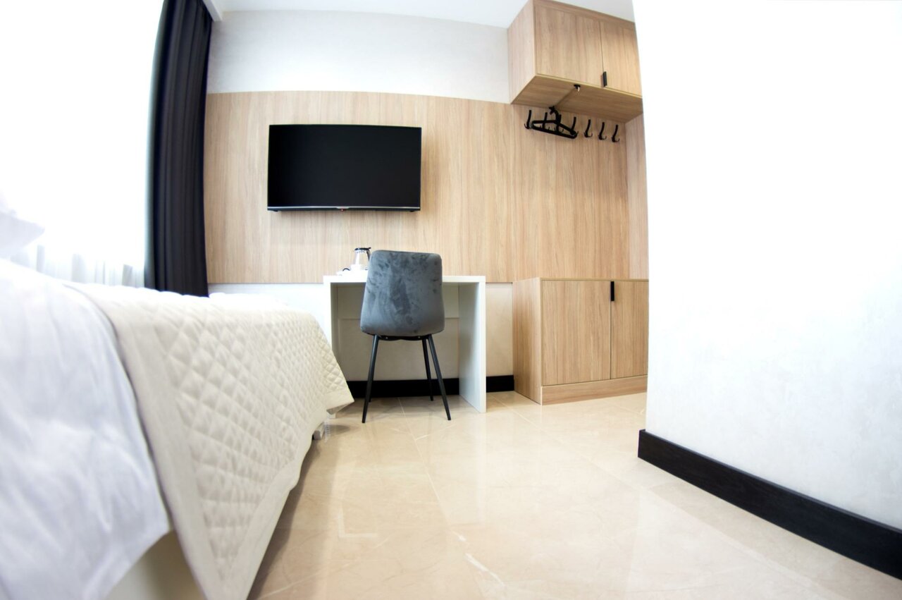 Классный отель! Очень вежливый, внимательный и обходительный персонал! Чистые и удобные номера, где есть всё необходимое, очень качественная и новая сантехника, вдоль здания удобная городская парковка, бесплатная, в соседней пекарне на выбор 4 вида завтрака, всё довольно вкусно и сытно, выпечка свежая, до достопримечательностей можно добраться или на автомобиле, или на общественном транспорте — займёт 10 минут, рядом парк, где находится колесо обозрения Небо33, сам город очень уютный и интересный!!!