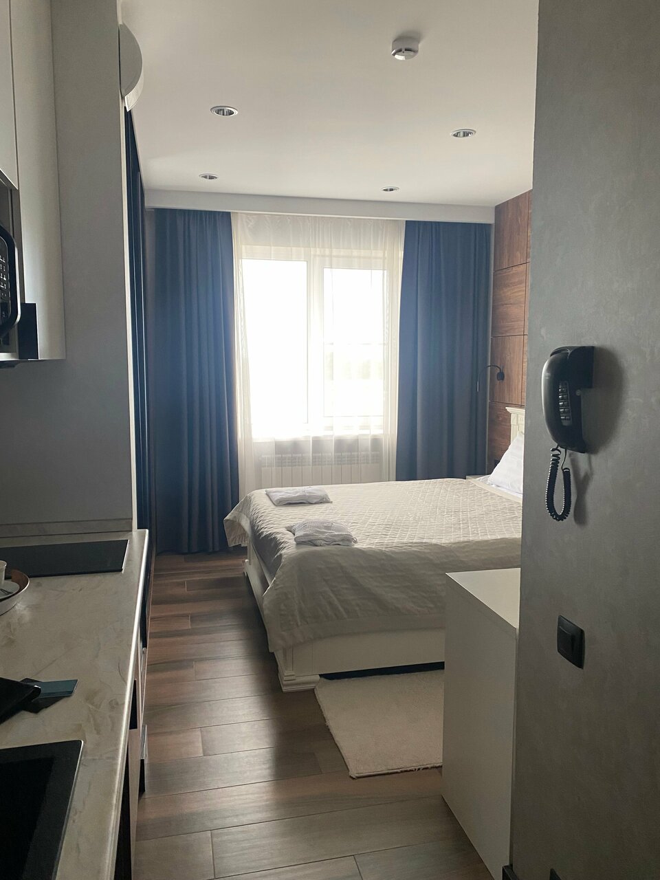Заезжали с подругой на выходные в эти апартаменты. По сути-маленькая квартира. Кухня, переходящая в комнату. Но для нас это был вполне удобный вариант, чисто переночевать. Мебель новая, сильная, внутри все чисто, полный комплект техники+ укомплектованная ванна