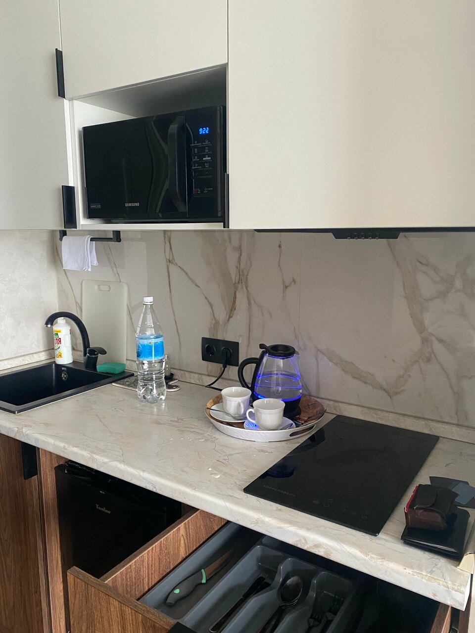 - Современные удобства (кондиционер, индукционная панель, микроволновка).