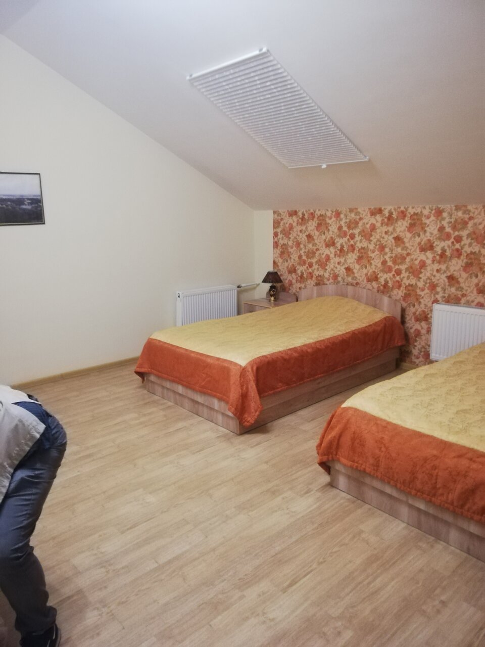 Приличный отель. Чисто. Уютно Номера довольно просторные. Мы проживали в 1 местном и 2 местном номерах на 4 мансардном этаже. Окна на крыше. Приходилось вставать на кровать, чтобы открывать/ закрывать жалюзи и окно. При открытом окне , если привыкли спать в тишине — будет не очень комфортно. Рядом в метрах 10 дорога, машины ездят круглосуточно, т.к. это шоссе. Завтрак включён. Шведский стол. Довольно скромный, если сравнивать с отелем Орион , например. Но вкусно. Есть спа зона за отдельную плату 600 руб за 2 часа. Матрасы удобные, постельное чистое. Мыльные принадлежности, тапки, полотенца, чай, сахар, чайник- всё есть в номере. Кулер на этаже. Номер следует бронировать заранее. Мы приехали без брони- пришлось ждать мин 15 — появления вдруг свободного. Нам повезло. Сразу 2 появилось. Есть бесплатная автостоянка. Минут в 10 пешком — магазин.