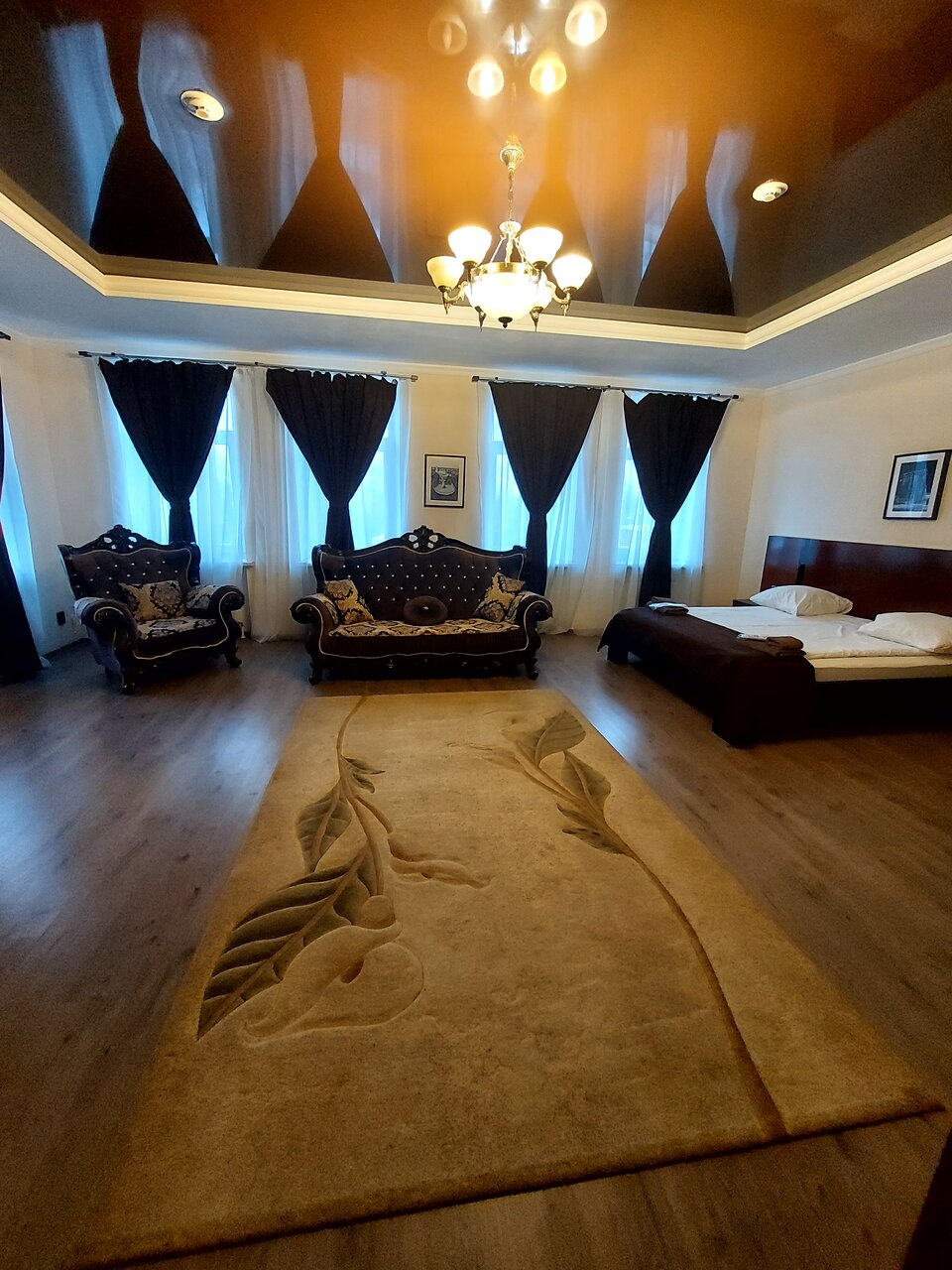 Номер с двумя комнатами вмещает до 4 человек.- двуспальная кровать и угловой диван- телевизор- тумбочки- зеркало- кондиционер- шкаф- холодильник- ванная с джакузиБронь на сайте!
