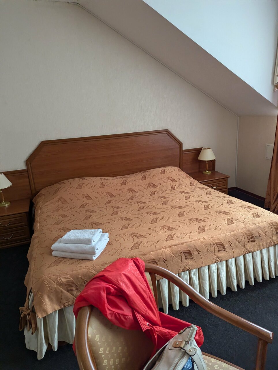 Номер полулюкс небольшой, на мансарде здания. Остерегаешься постоянно при под’ёме с кровати ‘вписаться’ в скат крыши. Диван не разборный и короткий, для сна подходит только ребёнку. В номере всего один стул и одна прикроватная тумбочка. Элетророзетка в каждой комнатке одна и в неё воткнут удлинитель на три розетки. В ванной комнате нет полотенцесушителя вообще. В общем троим взрослым тесно. Завтрак нормальный. Персонал приветлив. С авто парковкой проблемы, т.к. территория завалена снегом и проезд только для одной машины. ‘Мышеловка’ на парковке — хочешь выехать, беспокой постояльцев через персонал.