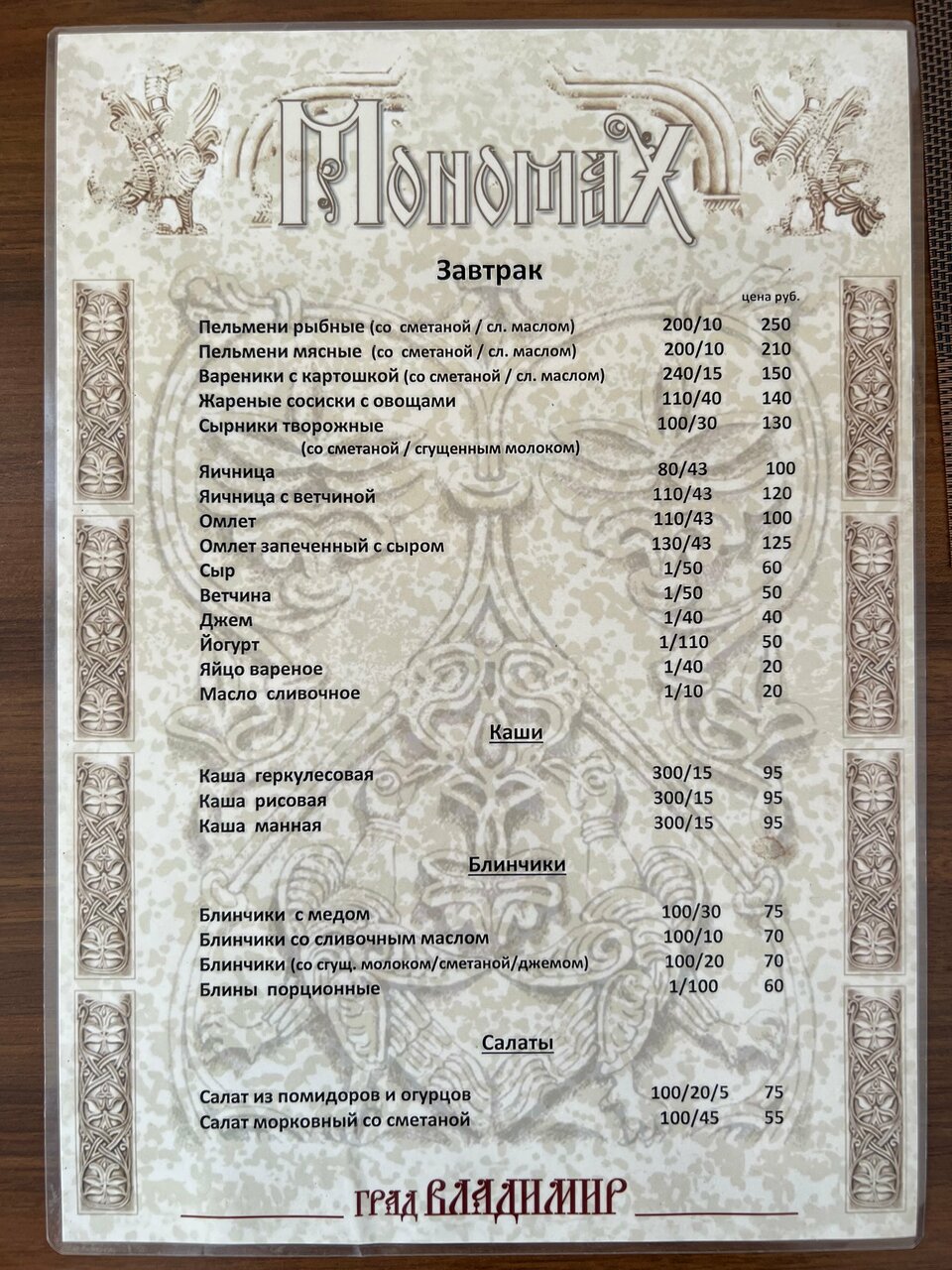Во Владимире была первый раз, очень понравилось! В ресторане Мономах очень уютная атмосфера, был комплексный обед: салат , борщ, картофель пюре с котлетой, блины и горячий чай! Было всё очень вкусно! Официанты молодые, очень вежливые, гостеприимные! Рекомендую посетить это место