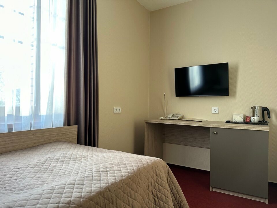 Чистый номер, все удобно. Есть в номере халат, тапки, зубная паста и т.д. Приветливый персонал. Хорошее расположение гостиницы. В ресторане вкусный завтрак, свежевыжатый сок.