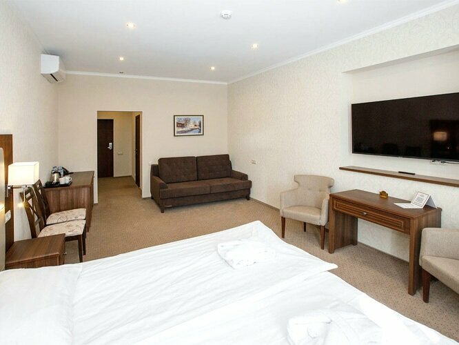 Актуальная цена доступна при выборе дат проживания. Двухкомнатный люкс с изысканной обстановкой, изящной мебелью и просторной гостиной - идеальный выбор для бизнес-путешественников и романтических пар!