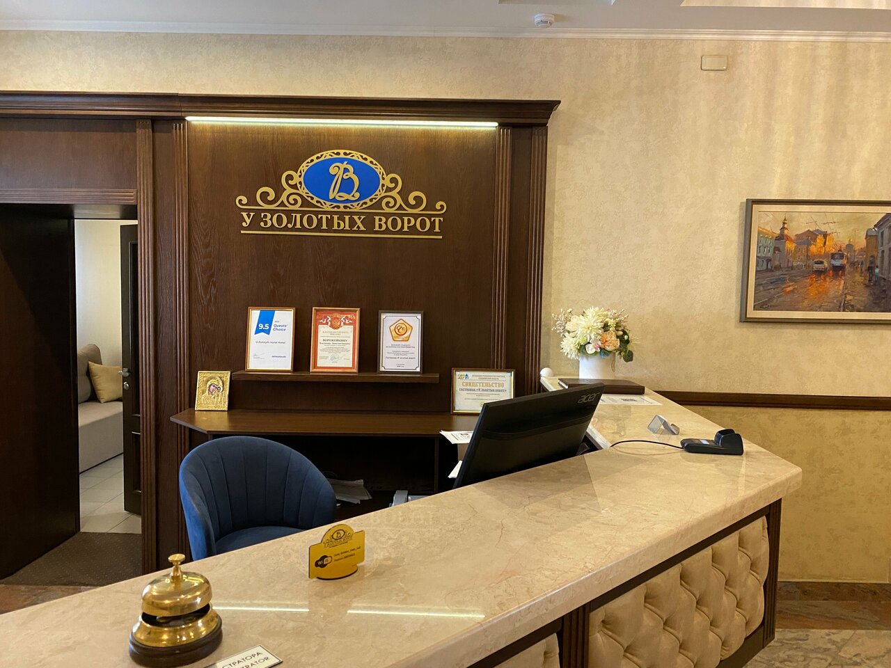 Очень приятное место в историческом центре города. До Золотых ворот рукой подать, Дмитровский и Успенский соборы также в шаговой доступности. Приятная входная группа, приветливые и дружелюбные сотрудники на ресепшн. Жили в люксе. Номер просторный, светлый, чистый. В каждой комнате большой телевизор. Ванная комната большая, с хорошей сантехникой, есть биде. Что касается оформления номера, здесь всё стандартно. Единственная особенность- картины местных художников на стенах с видами Владимира. Уборка проводилась регулярно. К качеству полотенец и халатов претензий нет. Лично для нас единственным небольшим минусом была слышимость в номере. Но со стенами из гипсокартона по-другому никак. Ещё большой плюс — ресторан Франки, расположенный рядом. Вышли из гостиницы, зашли в соседнюю дверь. Мы там завтракали и ужинали. Всё очень-очень вкусно! В общем, гостиницу ‘У золотых ворот’ однозначно рекомендую.