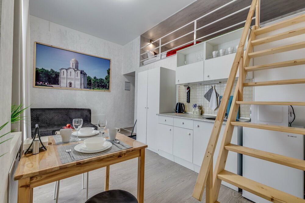 Снимали студию Успенский собор. Нам понравилось всё, но сняла звезду за шум с улицы. Спали с открытой форточкой ( иначе невозможно, душно) и в берушах. Я так и дома сплю, поэтому ничего плохого не увидела. Очень понравился балкон. Завтракали, да и просто отдыхали на нём. Конечно, было бы хорошо, хоть как то закрыть от соседнего балкона. Большим людям, может, будет трудно лазить на 2 этаж. Моей стройной дочери было в кайф там спать. Отдельно скажу — прекрасные и удобные спальные места, что вверху, что внизу. Очень понравились спальные принадлежности и бельё. Всё чистое свежее и качественное. Никаких посторонних запахов. Красивая и удобная посуда. На кухне есть всё, что может понадобиться. И, вообще, очень продумано всё. Да, и санузел очень понравился ( особенно душик специальный около унитаза). А расположение в самом ‘ сердце Владимира’, это восторг. Студия небольшая, но вдвоём, места достаточно.