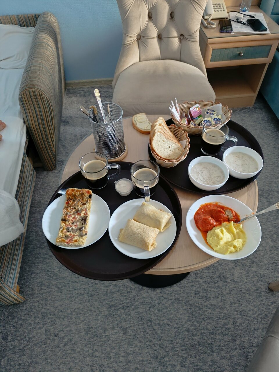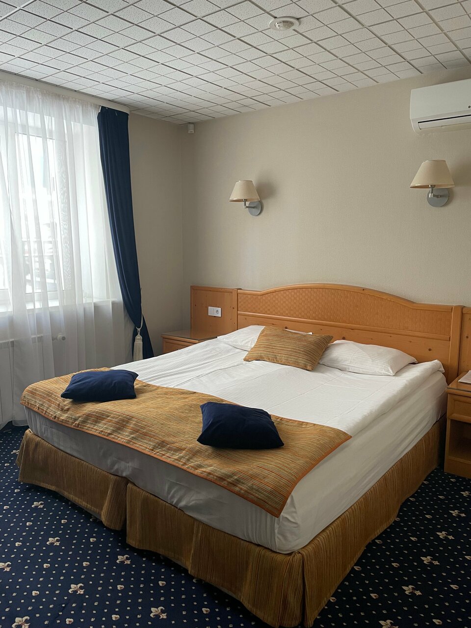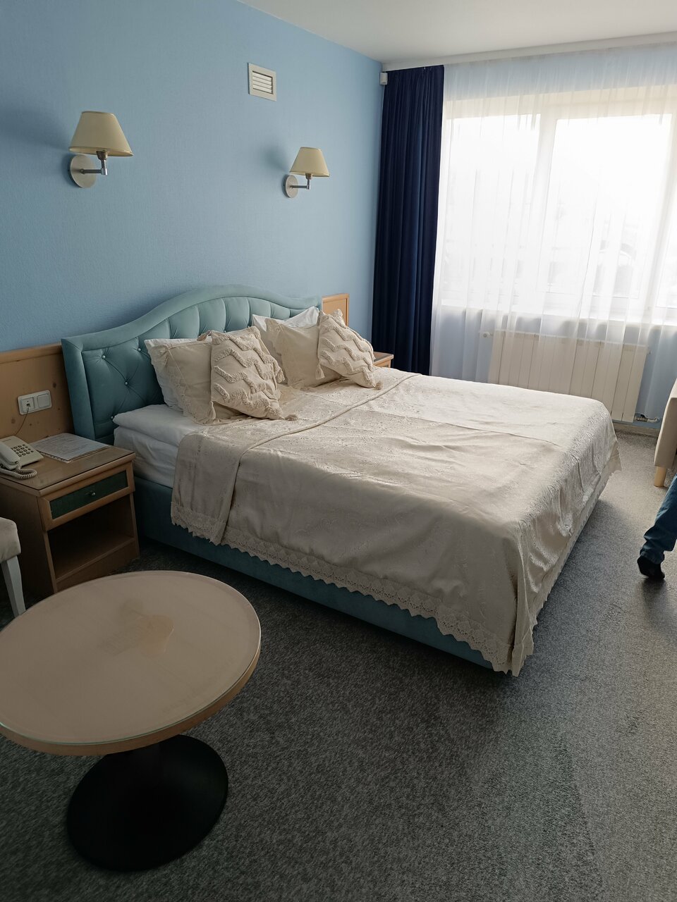 Просторный номер с большой двуспальной кроватью, мягкий тёплый пол — ковролин, розеток достаточно, чтоб зарядить все гаджеты, в ванной достаточно полочек и крючочков для всех полотенец. Завтрак в номер приносят — сытный и вкусный: каша, хлеб, масло, сыр плавленный треугольничком, мармелад, плюс на выбор горячее (омлет, сырники (очень вкусные) сосиски, чай-кофе. Тихо. Были после нового года, но ёлка стояла ещё и все номера украшены радостно
