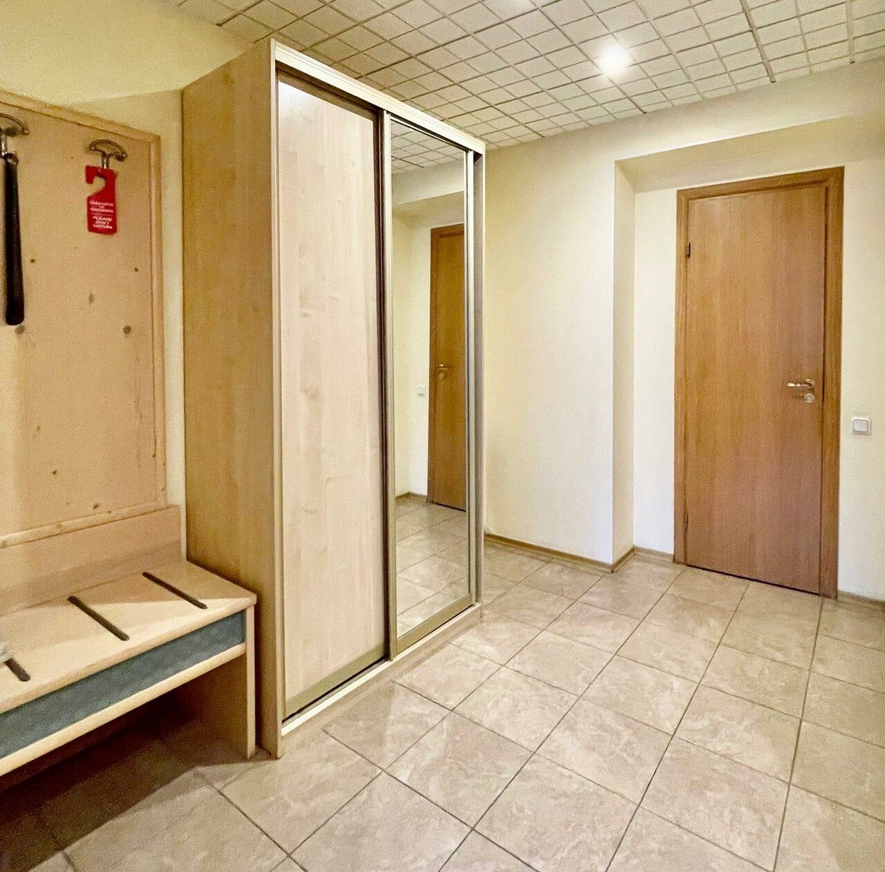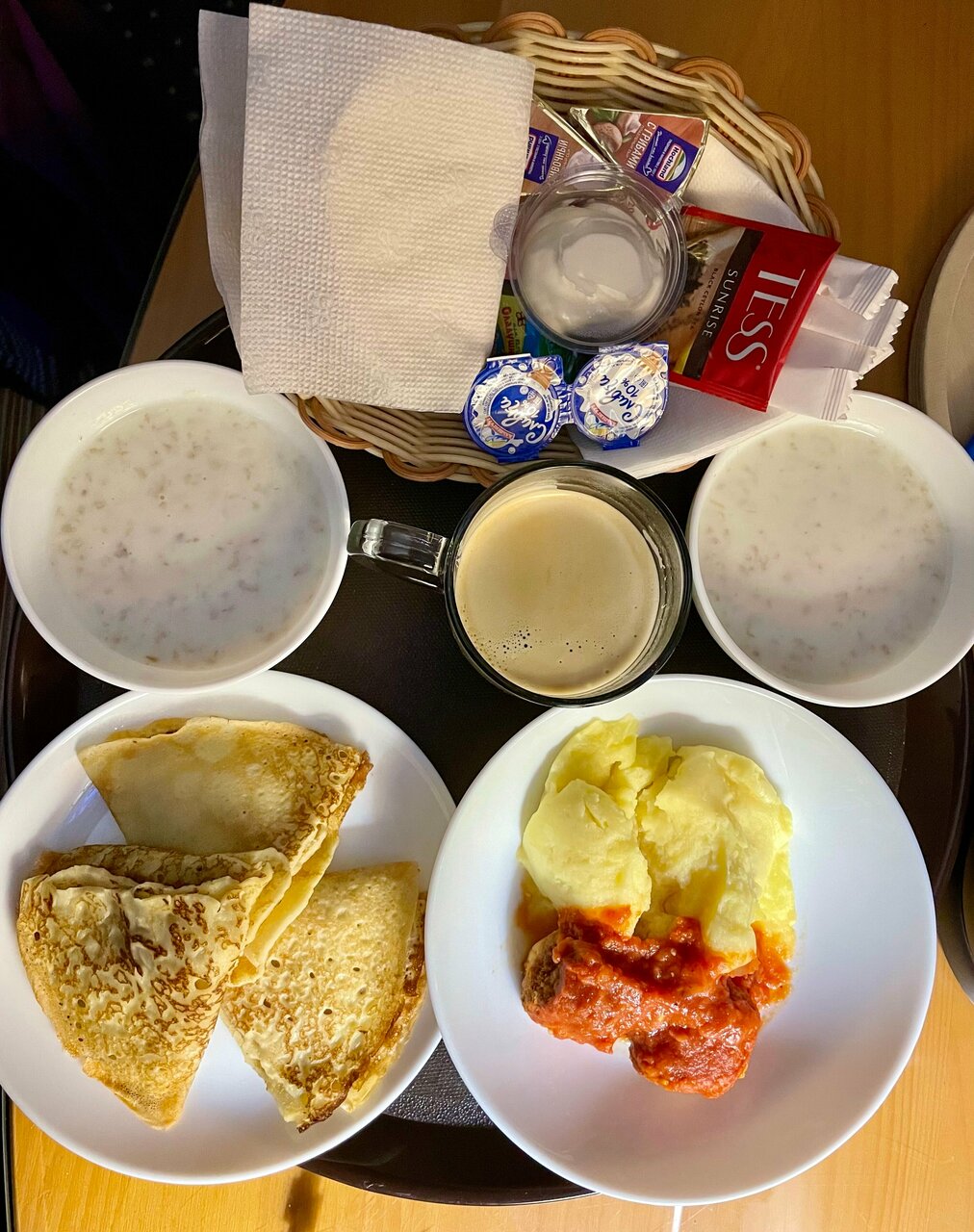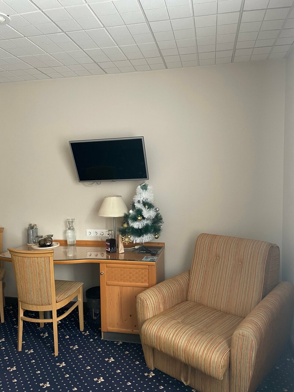 Просторный номер с большой двуспальной кроватью, мягкий тёплый пол — ковролин, розеток достаточно, чтоб зарядить все гаджеты, в ванной достаточно полочек и крючочков для всех полотенец. Завтрак в номер приносят — сытный и вкусный: каша, хлеб, масло, сыр плавленный треугольничком, мармелад, плюс на выбор горячее (омлет, сырники (очень вкусные) сосиски, чай-кофе. Тихо. Были после нового года, но ёлка стояла ещё и все номера украшены радостно