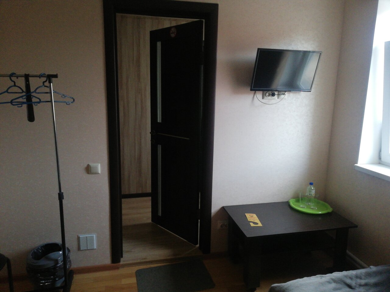 В гостинице оказались случайно , первая попавшая, не прогадали, одноместный номер, широкая кровать телевизор,санузел, душ, интереснна схема на два номера своя кухня, микроволновка, холодильник, плитка чайник, барная стойка, из минусов совсем крохотные номера, и почти полное отсутствие парковки