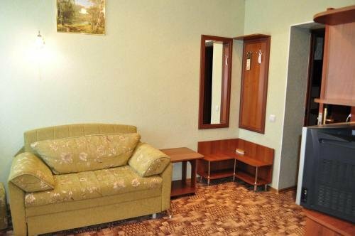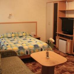 В номере: одна двуспальная кровать + диван, прикроватные тумбы,шкаф,вешалки для одежды,ЖК-телевизор,кухонные принадлежности