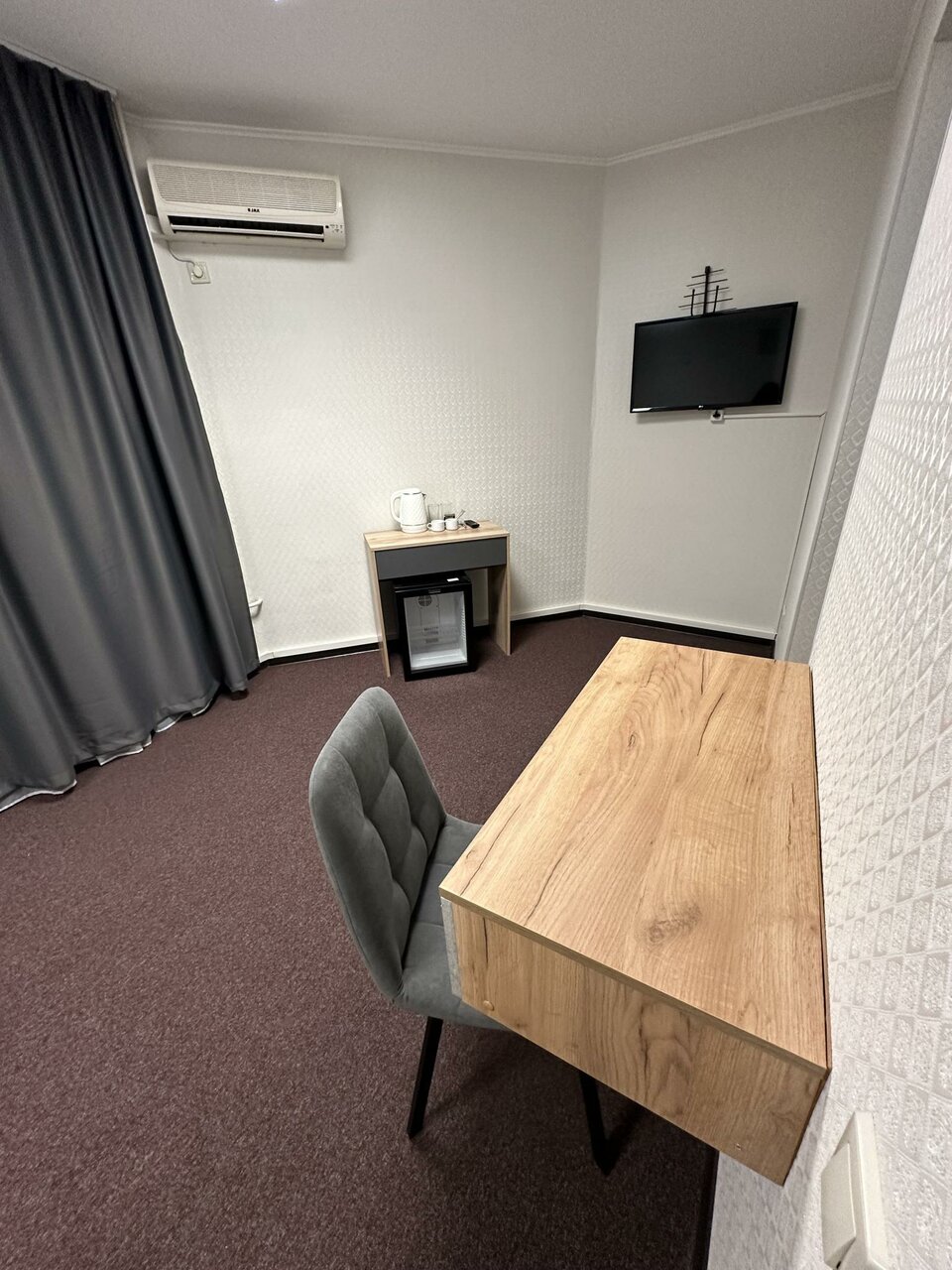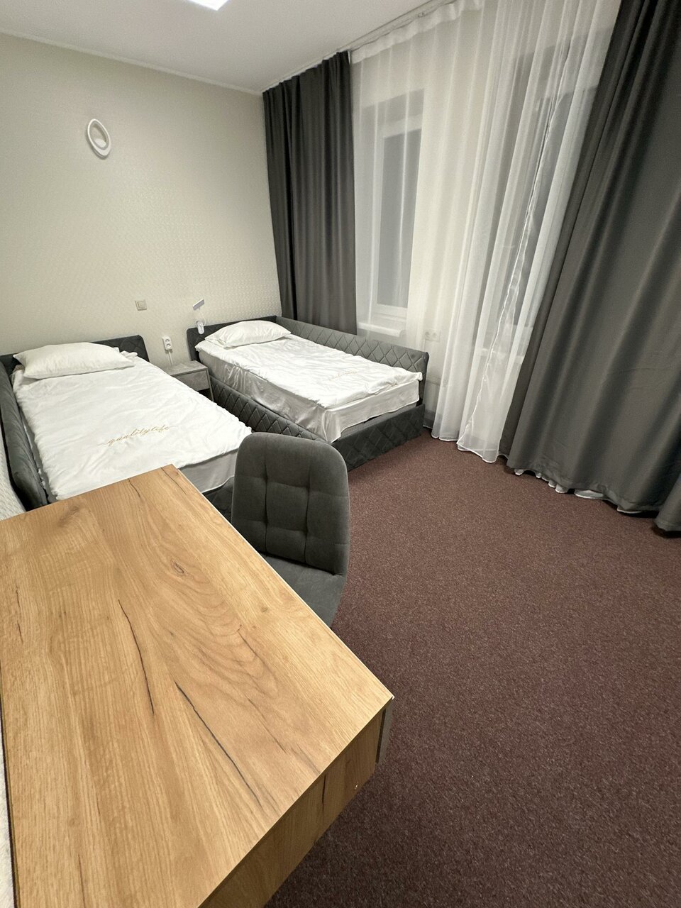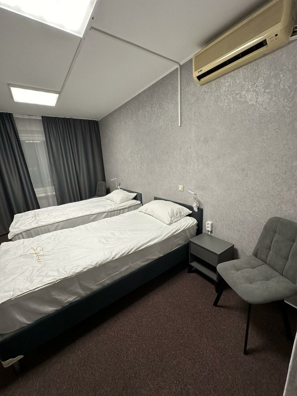 Гостиничный номер для размещения 2х человек. 2 одно-спальные кровати. Душ-туалет - отдельно выделенное помещение на 3 номера, кондиционер, холодильник, телевизор, чайник, Wi-fi .