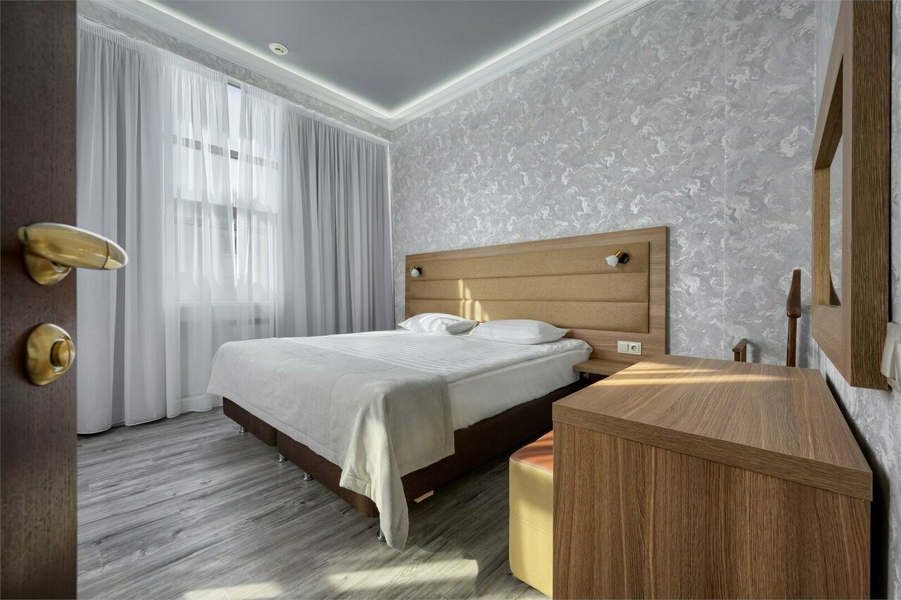 Изысканный дизайн каждого номера окунает в атмосферу роскоши и комфорта. Спальная зона с кроватью King Size отделена от просторной гостиной изящными шторами. Удобный кожаный диван располагает к дневному отдыху и просмотру любимых передач. Бесплатный