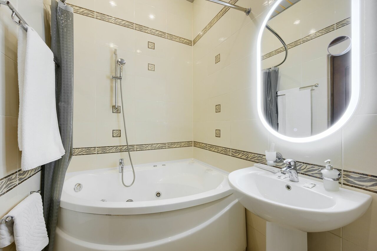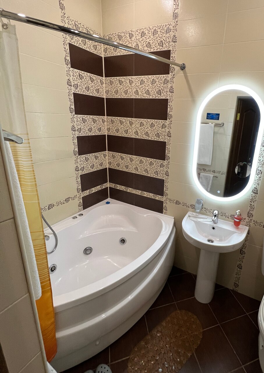 Благоустроенный номер, выполненный в классическом дизайне и мягких, располагающих к отдыху, тонах, подходит для проживания одного-двух человек. В уютной зоне отдыха - два кресла и журнальный столик, широкоформатный телевизор, холодильник, джакузи