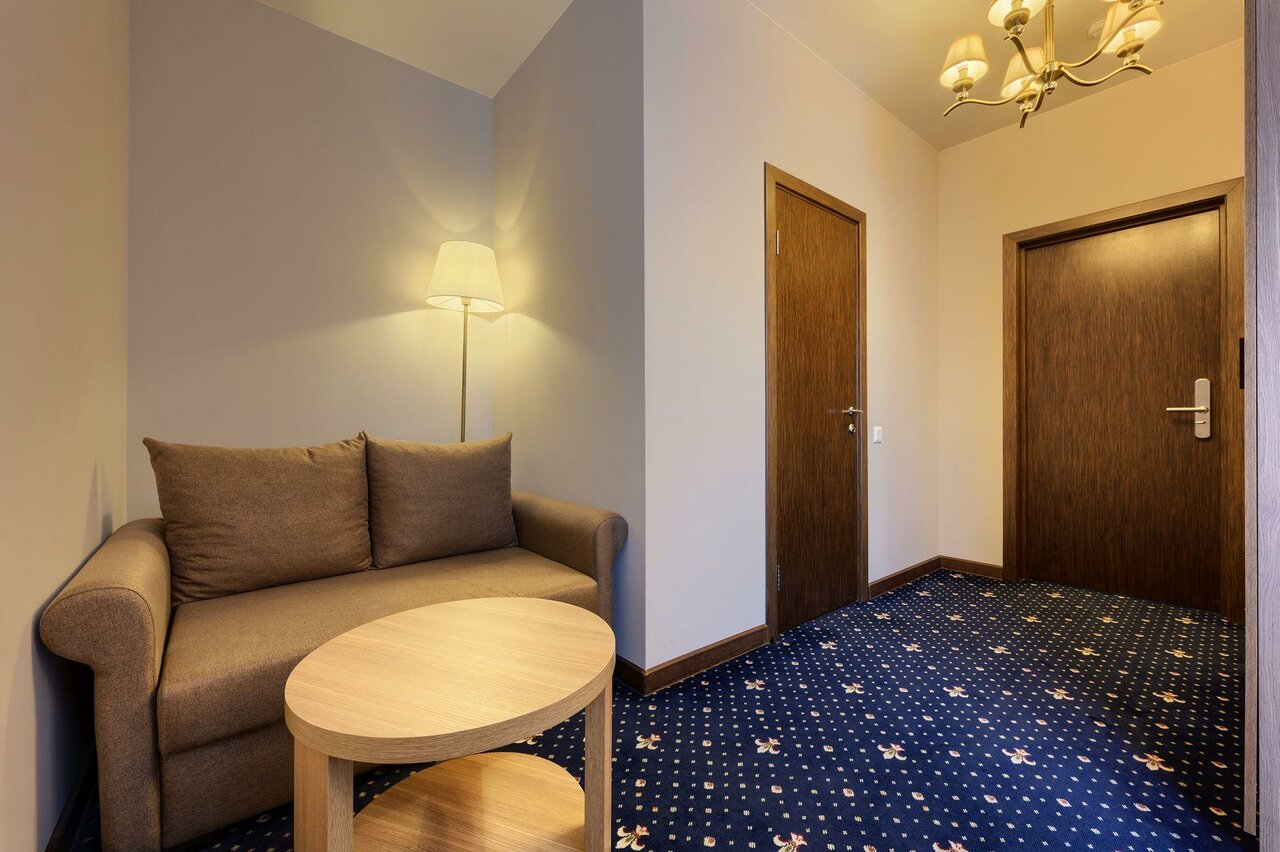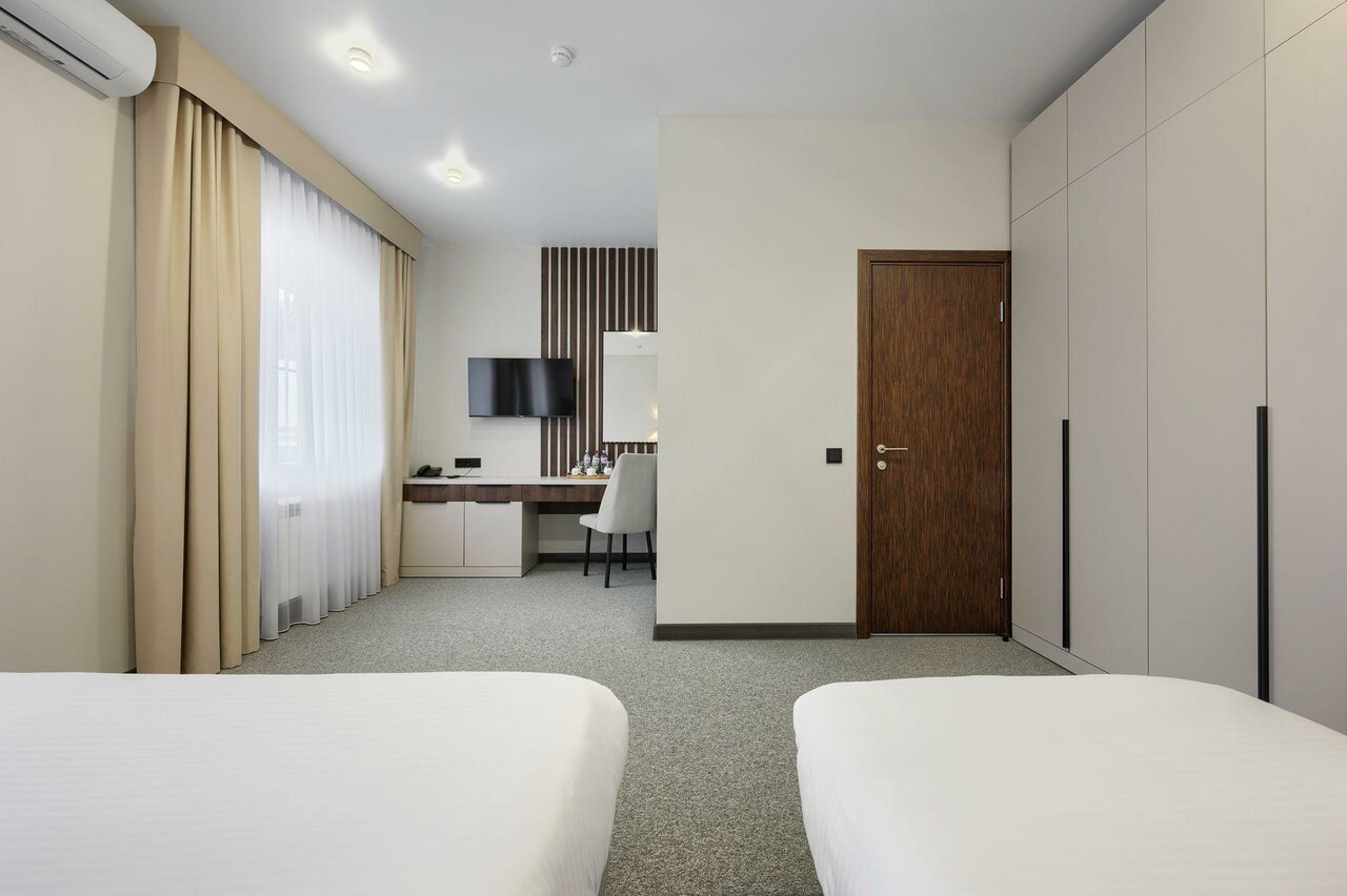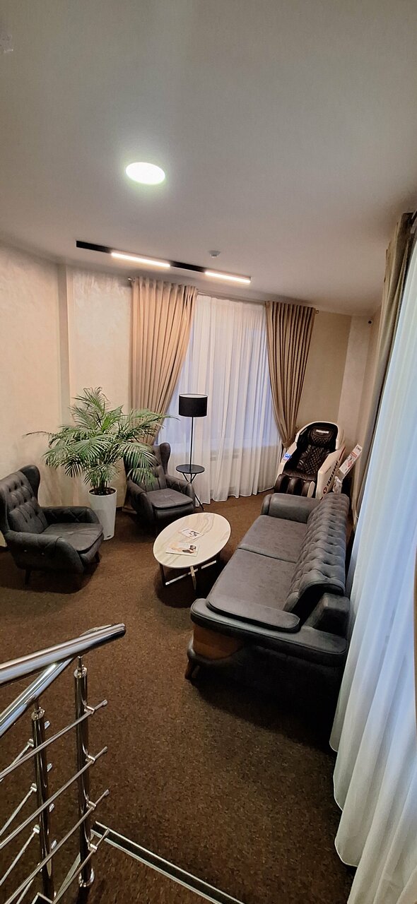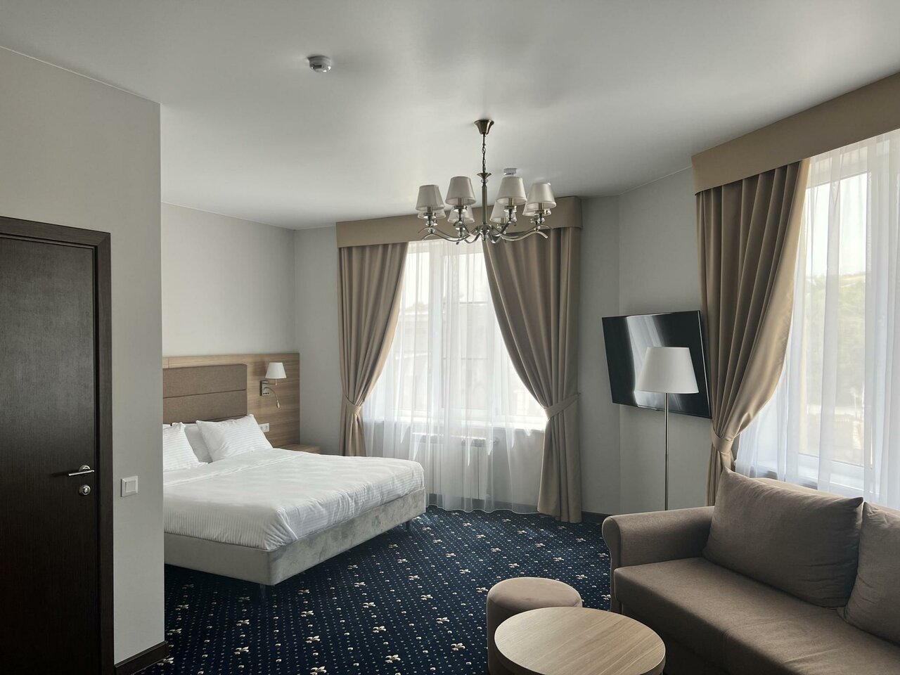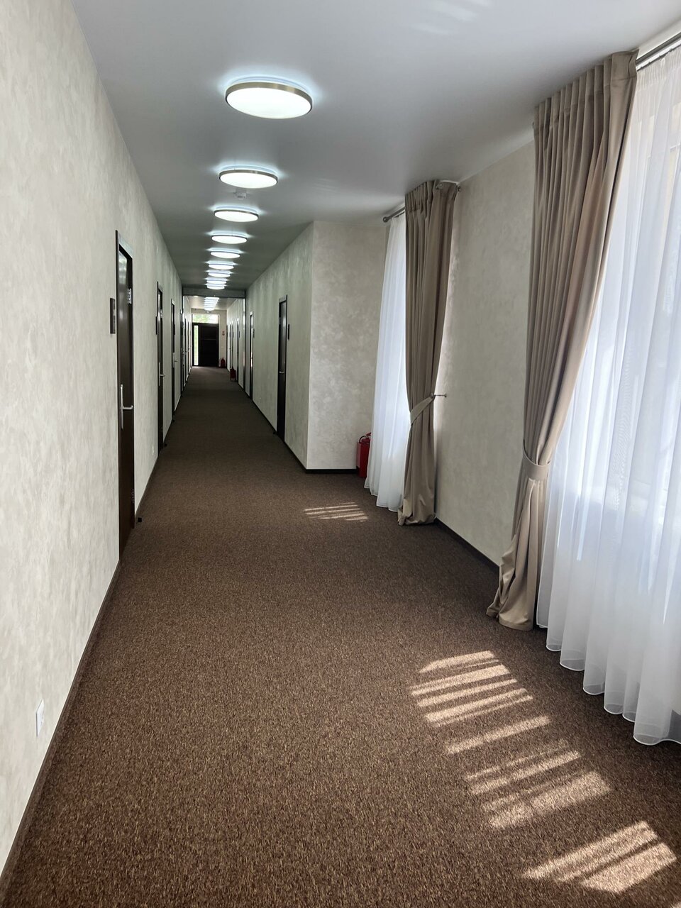Отличный отель. Просторные номера, хорошая мебель, есть все необходимое для проживания- холодильник, чайник, фен, тапочки, халаты, мыльные принадлежности, зубная паста и щётка, набор для шитья, для обуви губка и ложка, расчёска для волос. Хороший ремонт, все новое, широкая кровать для двоих. Есть набор чая и кофе, сахар, вода в бутылках. В коридоре кулер с водой, массажное кресло, зона отдыха с диваном и креслами. При гостинице отличное кафе, где можно вкусно поесть за приемлемые цены. Однозначно рекомендую данный отель!