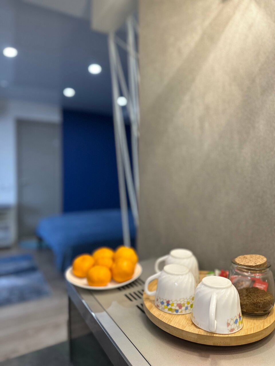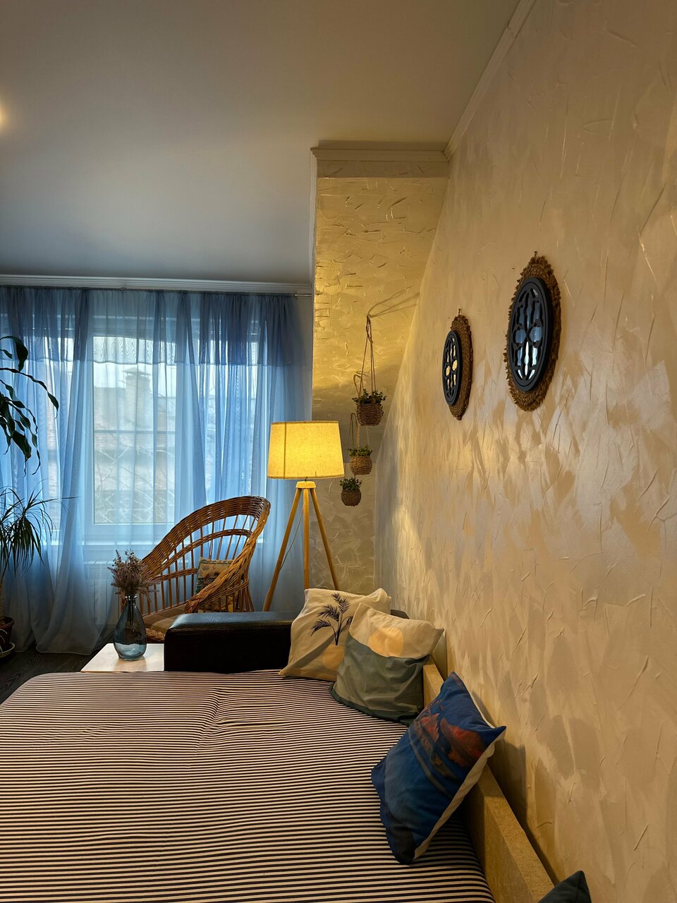 Уютная комната с дизайнерским оформлением. В номере двуспальная кровать и двуспальный диван. Телевизор смарт, чайник, фен, холодильник, сплит. Микроволновая печь и индукционная плита на 2 номера.