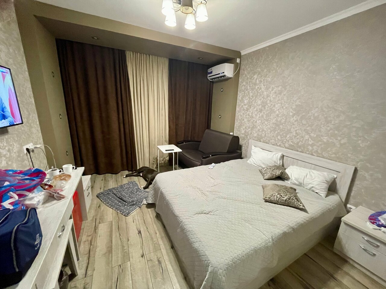Чисто, уютно, есть холодильник — большой плюс; два телевизора , кондиционер. Очень вежливый персонал. Парковка на территории. Само здание очень симпатичное.