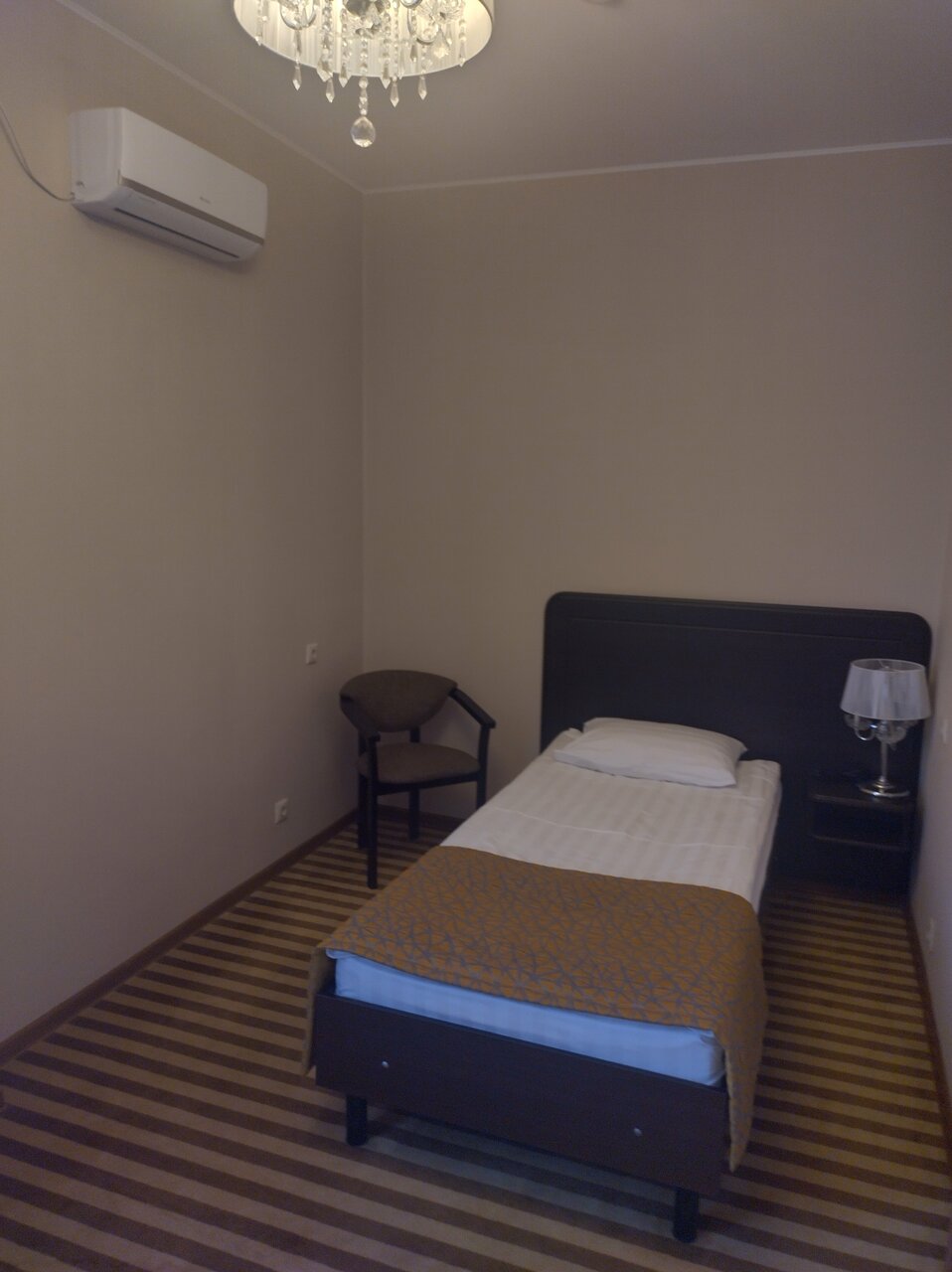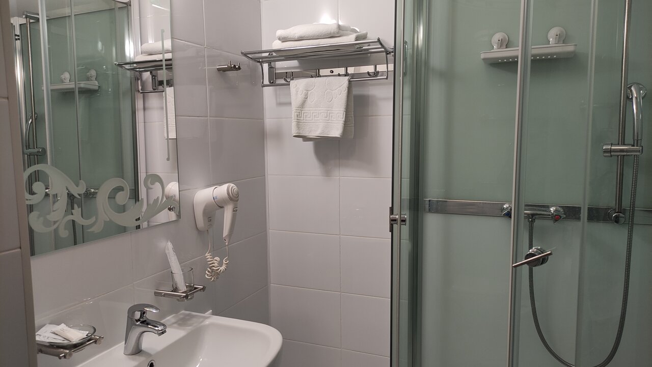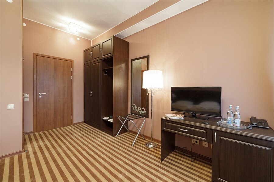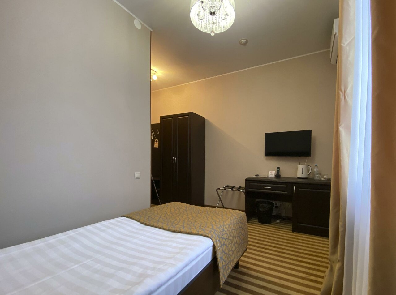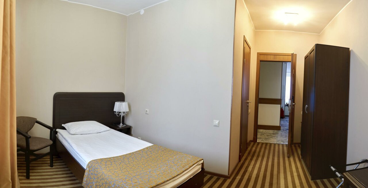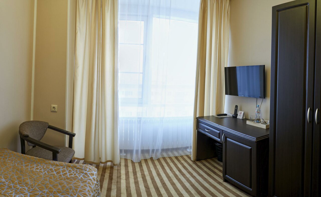 Одноместный Стандарт: в номере односпальная кровать, прикроватная тумбочка с персональным освещением, стол с пуфом, мини-холодильник, чайник, телевизор, шкаф для одежды с вешалками, тапочки, санузел: душевая кабина, туалет, раковина, зеркало, фен, ту