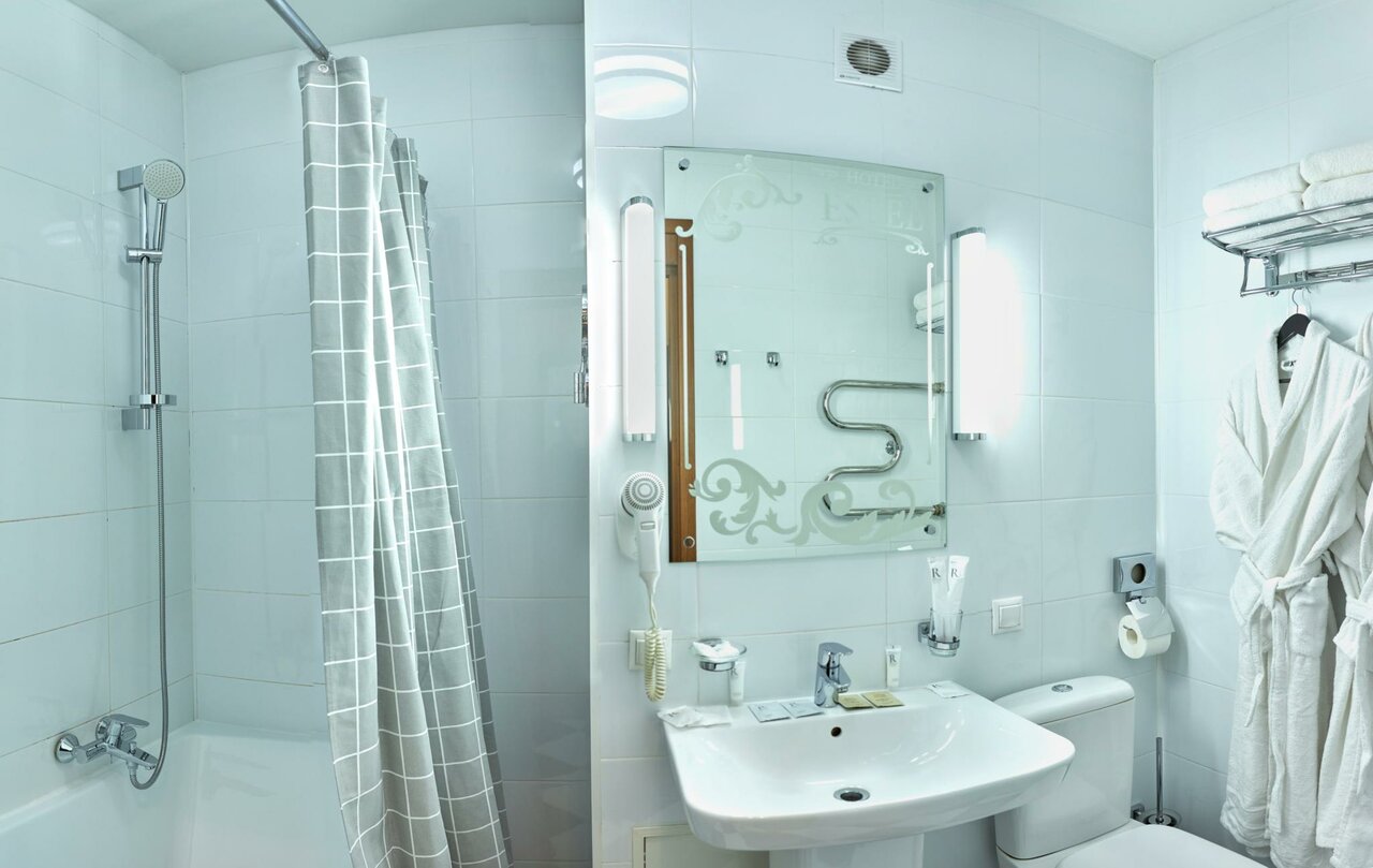 Двухместный Комфорт: в номере двуспальная кровать, прикроватные тумбочки с персональным освещением, стол с пуфом, мини-холодильник, чайник, телевизор, шкаф для одежды с вешалками, тапочки, санузел: душевая кабина, туалет, раковина, зеркало, фен, туал