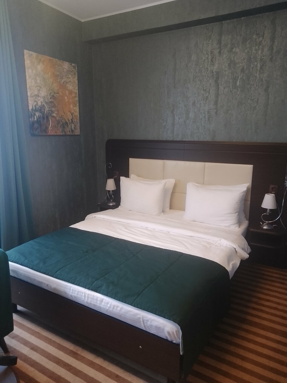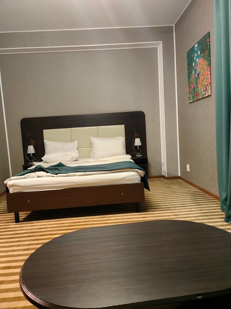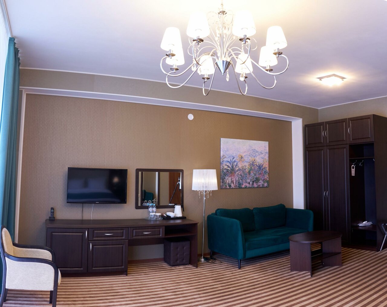 Двухместный Джуниор Сюит Гранд (люкс): в номере двуспальная кровать, прикроватные тумбочки с персональным освещением, декоративный диван (как доп.место не предоставляется), стол с пуфом, мини-холодильник, чайник, телевизор, шкаф-купе для одежды с веш