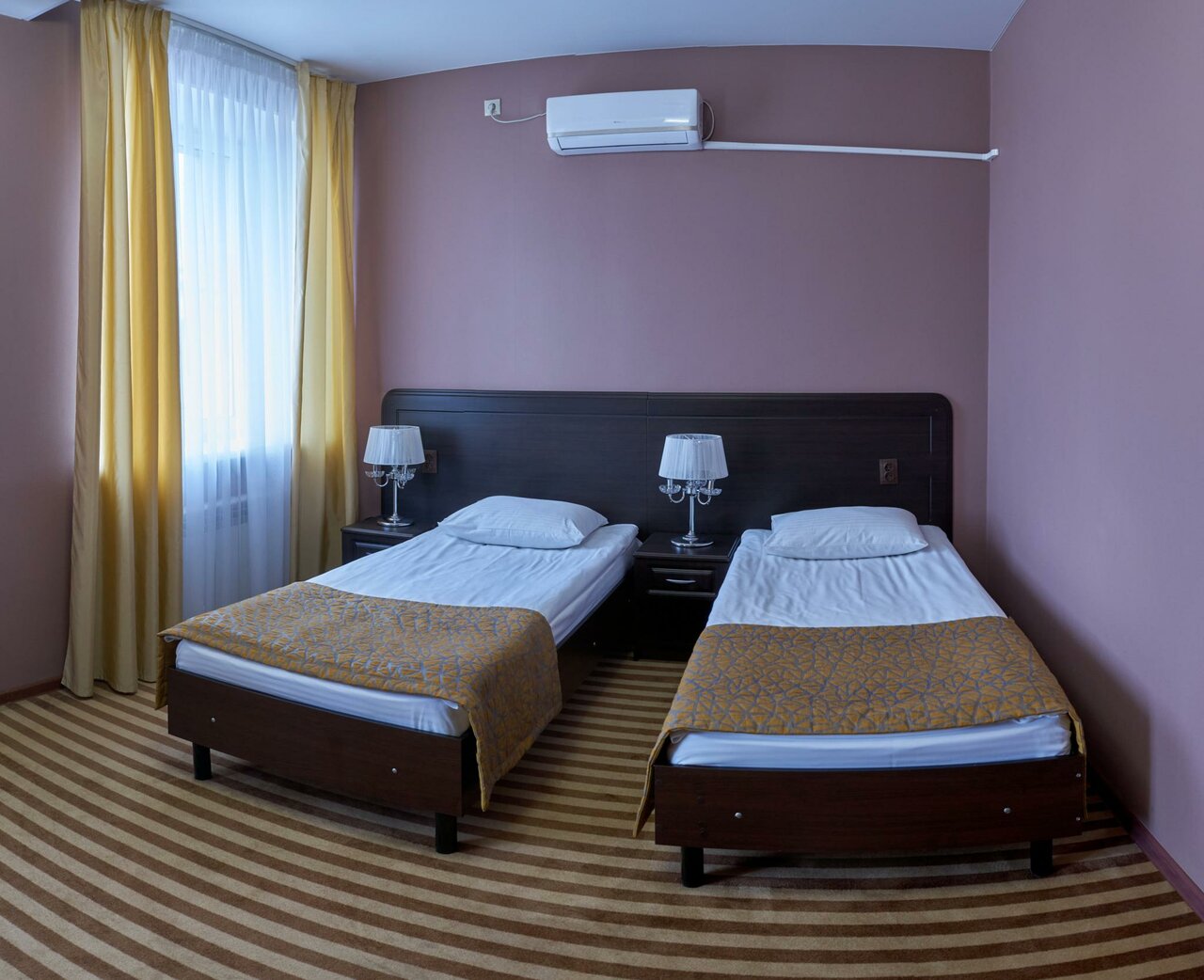 Двухместный Комфорт: в номере две односпальные кровати (с возможностью трансформирования в двуспальную), прикроватные тумбочки с персональным освещением, стол с пуфом, мини-холодильник, чайник, телевизор, шкаф для одежды с вешалками, тапочки, санузел